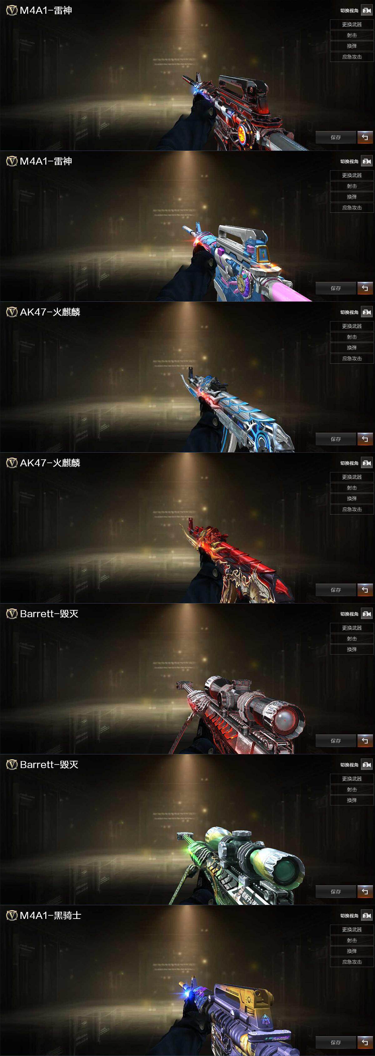 【英雄级武器】:M4A1-雷神,M4A1-黑骑士,M4A1-青龙,无影-神兵利器,黑武士-锦绣游龙,超新星-热带奇洋,QBZ03-金色蔷薇,黑骑士-海王,Barrett-极光,M200-幻神,炼狱-风暴,天神-动感闪耀,屠龙,龙啸-热带奇洋,手雷-动感闪耀,手雷-热带奇洋,闪光弹-云龙,M4A1-赤狱骑士,AWM-昌龙