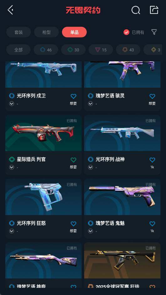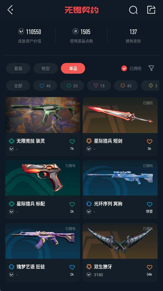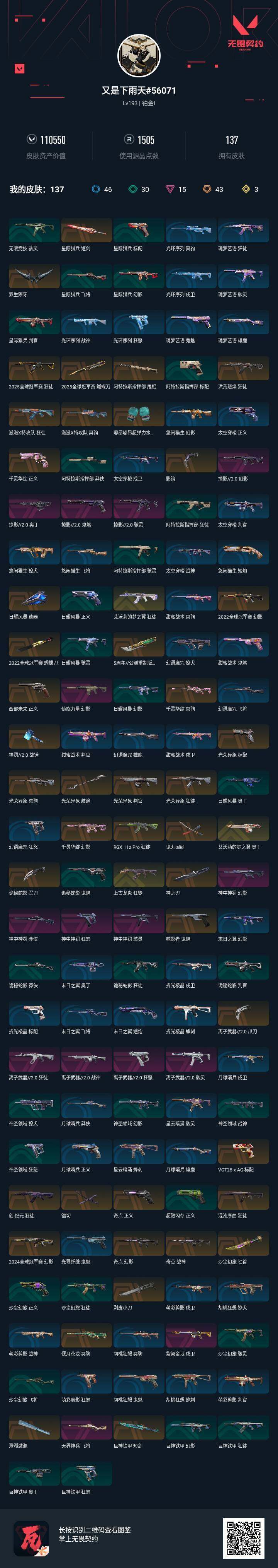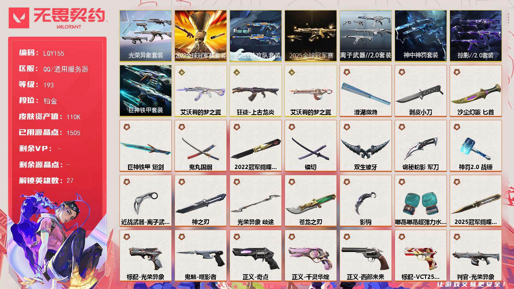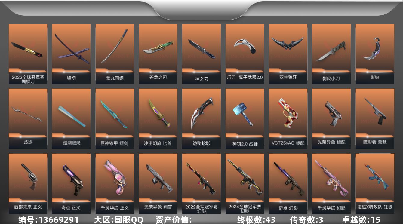 [13669291]皮肤资产价值110550【套装】:2025全球冠军赛套装,2022全球冠军赛套装,滋滋X特攻队套装,光荣异象套装,离子武器//2.0套装,神中神罚套装,掠影//2.0套装,巨神铁甲套装 【英雄】:幻棱,炼狱,维斯,暮蝶,钛狐,壹决,铁臂,捷风,雷兹,幽影,不死鸟,贤者,猎枭,蝰蛇,零,芮娜,奇乐,尚勃勒,霓虹,斯凯,夜露,星礈,K/O,海神,盖可,黑梦,钢锁 【近战 武器】:近战武器-2025全球冠军赛 蝴蝶刀,近战武器-2022全球冠军赛 蝴蝶刀,近战武器-嘟昂嘟昂超弹力水球拳套,近战武器-影钩,近战武器-5周年//公测重制版 苍龙之刃,近战武器-光荣异象 歧途,近战武器-神之刃,近战武器-剥皮小刀,近战武器-镭切,近战武器-澄湖潋滟,近战武器-鬼丸国纲,近战武器-离子武器//2.0 爪刀,近战武器-双生獠牙,近战武器-巨神铁甲 短剑,近战武器-沙尘幻旅 匕首,近战武器-诡秘蛇影 军刀,近战武器-神罚//2.0 战锤 【狂徒】:狂徒-艾沃莉的梦之翼,狂徒-上古龙炎,狂徒-2025全球冠军赛,狂徒-洪荒怒焰,狂徒-混沌序曲,狂徒-创·纪元,狂徒-RGX 11z Pro,狂徒-光荣异象,狂徒-滋滋X特攻队,狂徒-离子武器//2.0,狂徒-巨神铁甲,狂徒-沙尘幻旅,狂徒-诡秘蛇影 【幻影】:幻影-2022全球冠军赛,幻影-2024全球冠军赛,幻影-奇点,幻影-千灵华绽,幻影-侦察力量,幻影-神中神罚,幻影-掠影//2.0,幻影-巨神铁甲,幻影-神圣领域,幻影-末日之翼 【戍卫】:戍卫-紫阙金琅,戍卫-萌彩剪影,戍卫-月球哨兵,戍卫-折光棱晶 【獠犬】:獠犬-神圣领域,獠犬-胡桃狂想 【冥驹】:冥驹-千灵华绽,冥驹-偃月苍龙,冥驹-光荣异象,冥驹-滋滋X特攻队,冥驹-胡桃狂想 【飞将】:飞将-天界神兵,飞将-沙尘幻旅,飞将-末日之翼 【莽侠】:莽侠-神中神罚,莽侠-诡秘蛇影,莽侠-月球哨兵 【战神】:战神-奇点,战神-离子武器//2.0,战神-神圣领域,战神-萌彩剪影 【奥丁】:奥丁-艾沃莉的梦之翼,奥丁-掠影//2.0,奥丁-巨神铁甲,奥丁-末日之翼 【判官】:判官-光荣异象,判官-诡秘蛇影,判官-萌彩剪影 【雄鹿】:雄鹿-月球哨兵 【骇灵】:骇灵-离子武器//2.0,骇灵-神中神罚,骇灵-掠影//2.0,骇灵-沙尘幻旅,骇灵-无限竞技,骇灵-星云暗涌 【蜂刺】:蜂刺