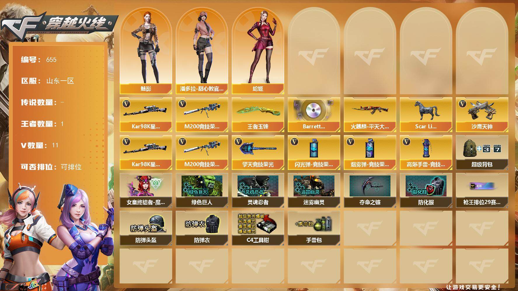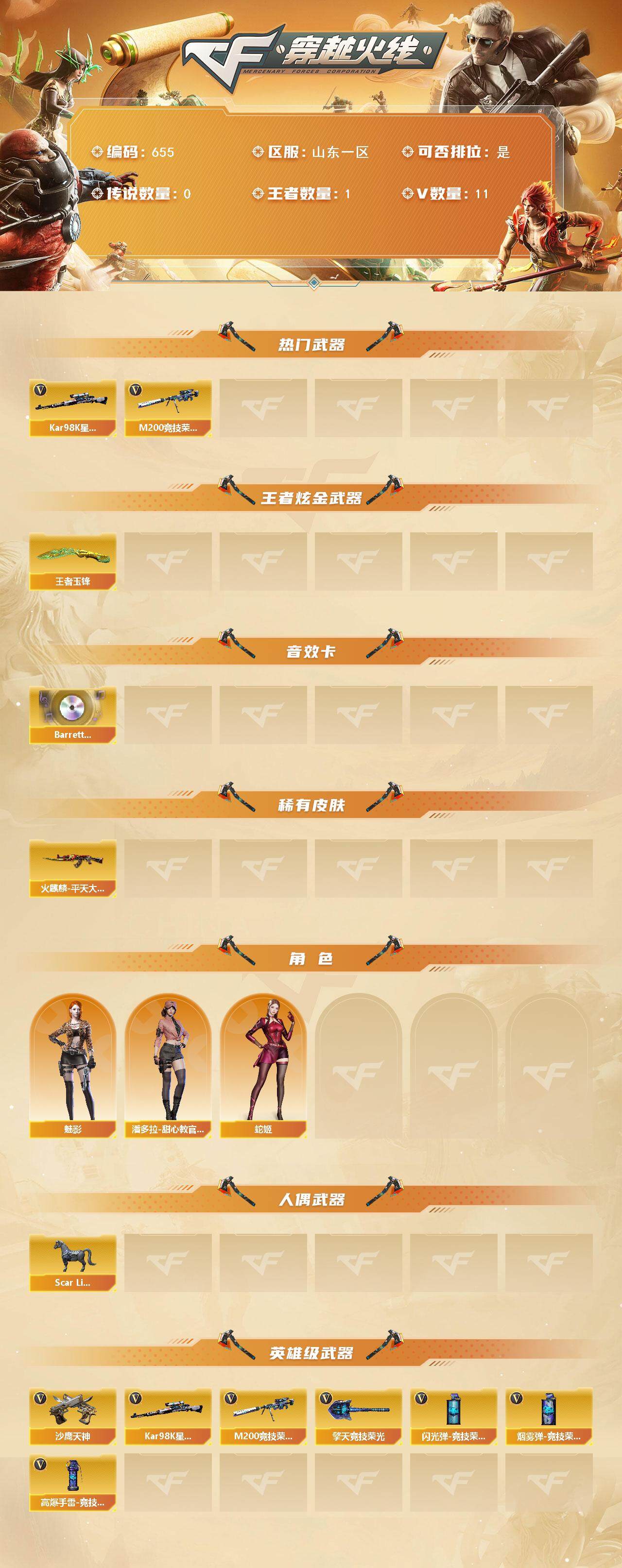 [13678051]山东一区-11V-1王者-0炫金 【热门武器】:M200-竞技荣光,Kar98K-星神 【王者炫金武器】:王者玉锋 【音效卡】:Barrett-碧霄极光音效卡 【皮肤】:火麒麟-平天大圣 【角色】:魅影,潘多拉-甜心教官,蛇姬 【人偶武器】:Scar Light-马枪 【英雄级武器】:Kar98K-星神,M200-竞技荣光,沙鹰-天神,擎天-竞技荣光,高爆手雷-竞技荣光*2,闪光弹-竞技荣光*2,烟雾弹-竞技荣光*2 【道具】:超级背包,女皇终结者-魔龙之吻,绿色巨人,灵魂忍者,迷雾幽灵,夺命之镰,防化服*2,枪王排位29赛季金色流光,防弹头盔*2,防弹衣*2,C4工具钳*2,手雷包*2 【特殊枪械】: