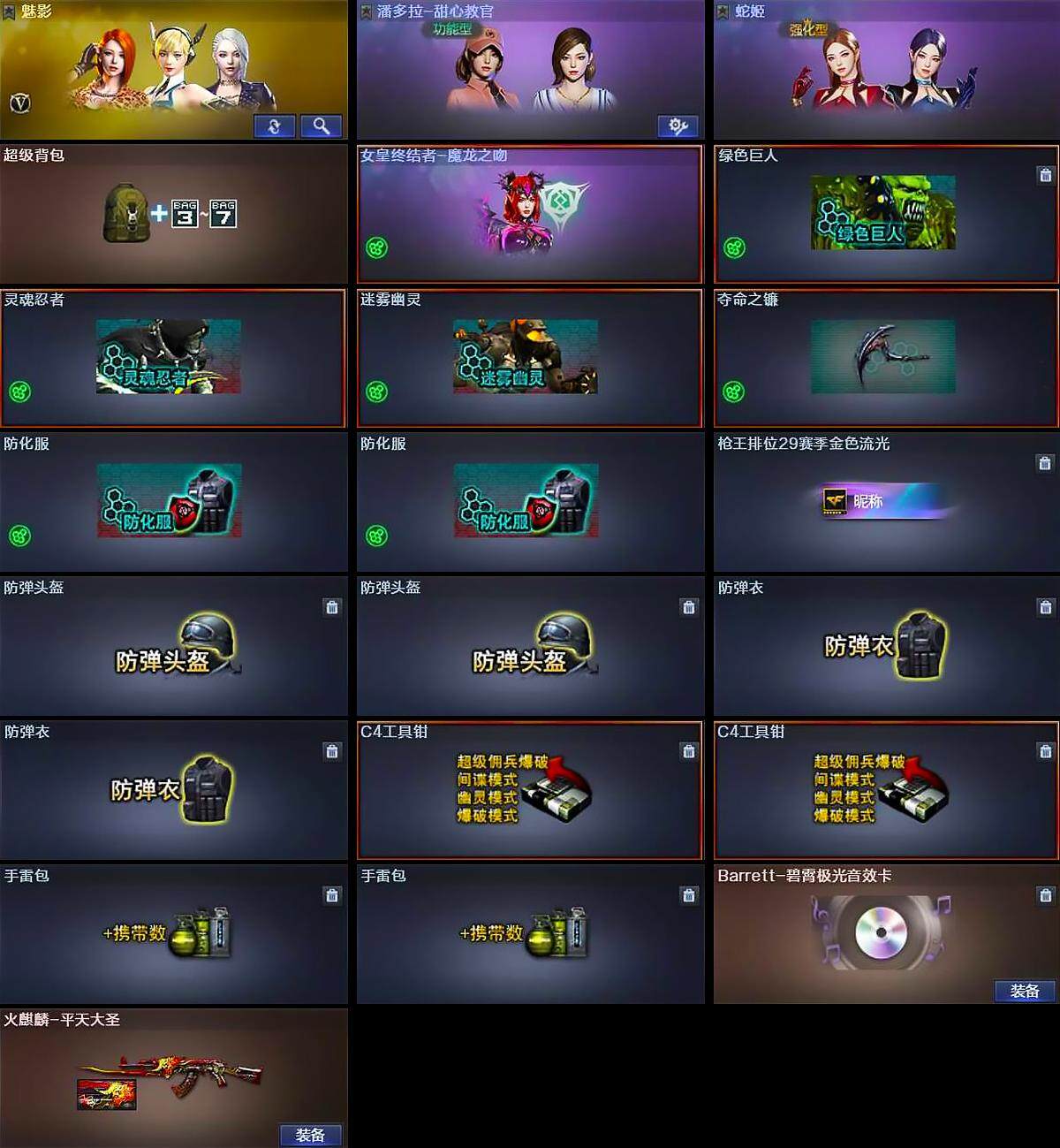 【道具】:超级背包,女皇终结者-魔龙之吻,绿色巨人,灵魂忍者,迷雾幽灵,夺命之镰,防化服*2,枪王排位29赛季金色流光,防弹头盔*2,防弹衣*2,C4工具钳*2,手雷包*2