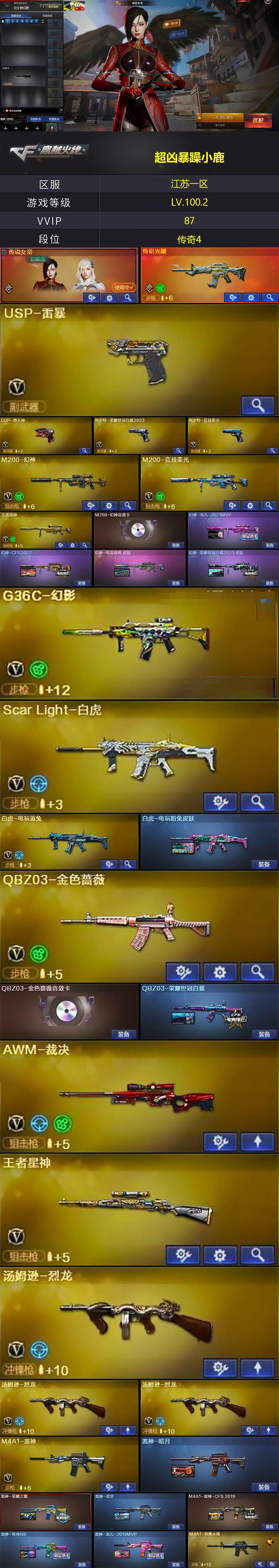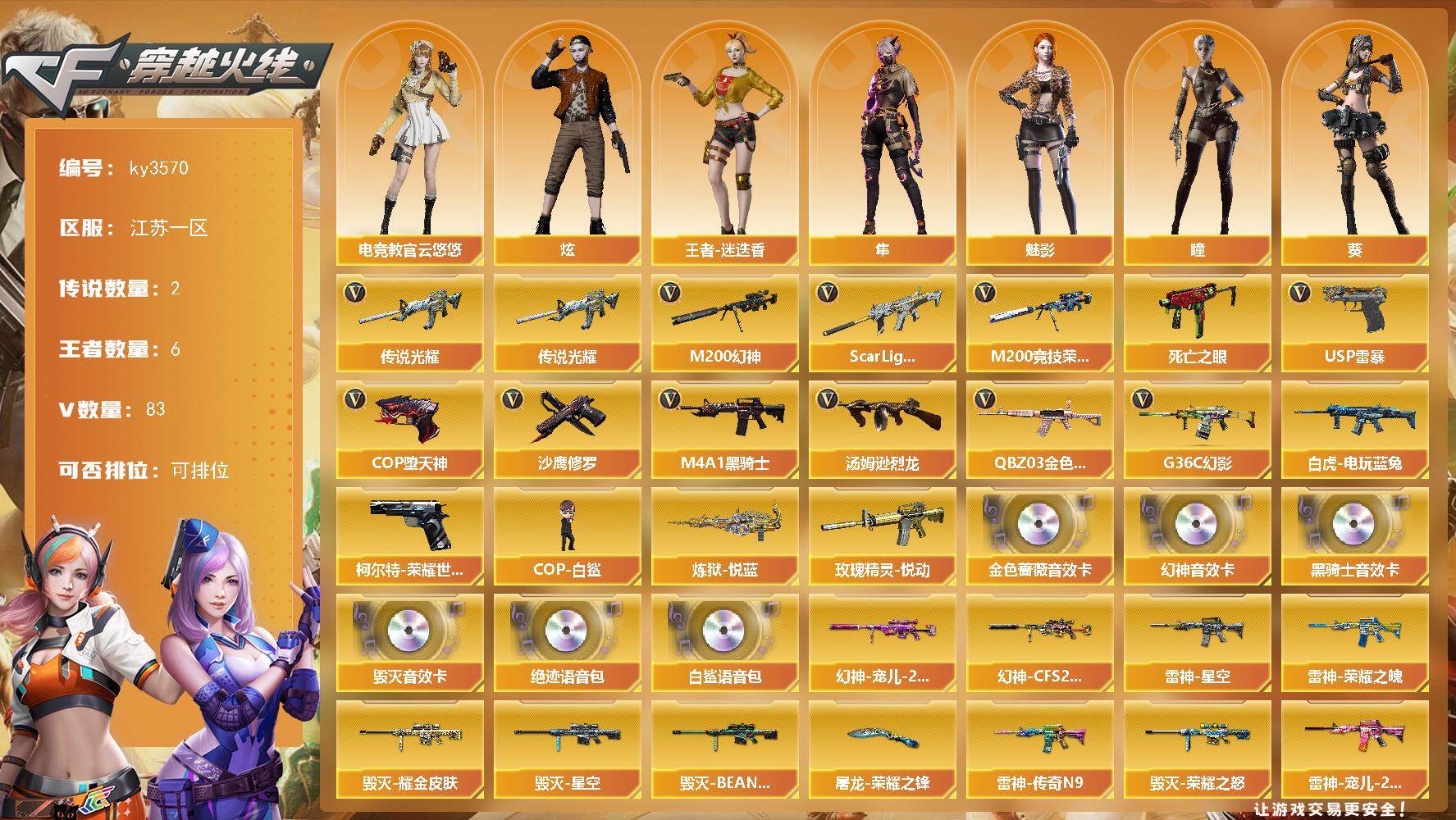 [13784452]江苏一区-83V-6王者-0炫金 【传说武器】:传说光耀 【传说角色】:传说女帝 【热门武器】:传说光耀,G36C-幻影,QBZ03-金色蔷薇,Scar Light-白虎,M200-幻神,柯尔特-荣耀世冠白鲨2023,M200-竞技荣光,死亡之眼*2,白虎-电玩蓝兔,M4A1-黑骑士,汤姆逊-烈龙*3,COP-白鲨,USP-雷暴,COP-堕天神,沙鹰-修罗*4 【王者炫金武器】:玫瑰精灵-悦动,炼狱-悦蓝 【音效卡】:M200-幻神音效卡,M4A1-黑骑士音效卡,Barrett-毁灭音效卡,QBZ03-金色蔷薇音效卡,绝迹语音包,白鲨语音包 【皮肤】:幻神-宠儿-2021MVP,幻神-CFS2022,幻神-电流骇客 皮肤,幻神-荣耀世冠白鲨2023 皮肤,白虎-电玩粉兔皮肤,QBZ03-荣耀世冠白鲨,雷神-暗月,雷神-荣耀之魄,雷神-星空,M4A1-雷神-CFS 2019,雷神-传奇N9,雷神-宠儿-2019MVP,M4A1-再燃火线,火麒麟-雷神,火麒麟-盘古,火麒麟-巅峰荣耀,毁灭-暗月*2,毁灭-荣耀之怒,毁灭耀金皮肤,毁灭-星空,毁灭-BEAN-2020MVP,毁灭-魔灵皮肤,黑龙-能量核心,黑龙-暗月,黑骑士-暗月,黑骑士-地狱火,黑骑士-CFS2021,黑骑士-伏羲,无影-暗月,无影-能量核心,死神-秘银*2,天启-暗月,战神-粉色甜心皮肤,战神-流金岁月皮肤,AK47-B-常胜将军-曹操,AK47-B-常胜将军-刘备,天龙-能量核心,极光-能量核心,修罗-能量核心*2,天神-暗月*2,屠龙-荣耀之锋,轻型军用手斧-再燃火线 【角色】:零,葵,瞳,魅影,炫,电竞教官-云悠悠,隼,王者-迷迭香,芳心审判者,麻雀,潘多拉-X,潜龙队-X,雪莉杨-摸金校尉,影武者-X 【人偶武器】:COP-白鲨,COP-旗袍,闪光弹-貂蝉,高爆手雷-大乔,迷你超能女侍 【暴走生化】:死亡之眼*2 【挑战大师】:AK47-冰龙粉碎者,激光毁灭者III 【英雄级武器】:M4A1-千变,AK47-火麒麟,M4A1-黑龙,M4A1-雷神,M4A1-黑骑士,AK47-无影,M4A1-死神,AK47-黑武士,M4A1-武圣,AK47-机械迷城*2,AK47-黑鲨,Scar Light-白虎,G36C-幻影,QBZ03-金色蔷薇,M4A1-猎神,白虎-电玩蓝兔,AWM-天龙,Barret