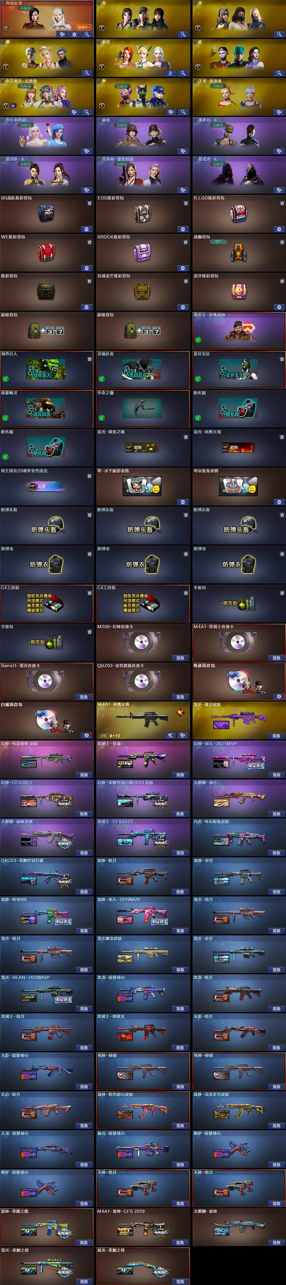 【皮肤】:幻神-宠儿-2021MVP,幻神-CFS2022,幻神-电流骇客 皮肤,幻神-荣耀世冠白鲨2023 皮肤,白虎-电玩粉兔皮肤,QBZ03-荣耀世冠白鲨,雷神-暗月,雷神-荣耀之魄,雷神-星空,M4A1-雷神-CFS 2019,雷神-传奇N9,雷神-宠儿-2019MVP,M4A1-再燃火线,火麒麟-雷神,火麒麟-盘古,火麒麟-巅峰荣耀,毁灭-暗月*2,毁灭-荣耀之怒,毁灭耀金皮肤,毁灭-星空,毁灭-BEAN-2020MVP,毁灭-魔灵皮肤,黑龙-能量核心,黑龙-暗月,黑骑士-暗月,黑骑士-地狱火,黑骑士-CFS2021,黑骑士-伏羲,无影-暗月,无影-能量核心,死神-秘银*2,天启-暗月,战神-粉色甜心皮肤,战神-流金岁月皮肤,AK47-B-常胜将军-曹操,AK47-B-常胜将军-刘备,天龙-能量核心,极光-能量核心,修罗-能量核心*2,天神-暗月*2,屠龙-荣耀之锋,轻型军用手斧-再燃火线