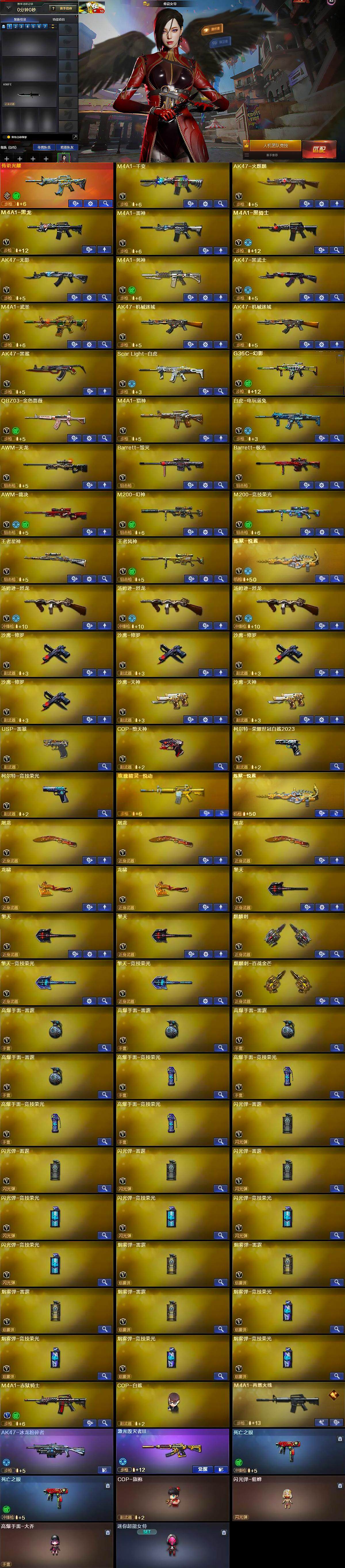 【热门武器】:传说光耀,G36C-幻影,QBZ03-金色蔷薇,Scar Light-白虎,M200-幻神,柯尔特-荣耀世冠白鲨2023,M200-竞技荣光,死亡之眼*2,白虎-电玩蓝兔,M4A1-黑骑士,汤姆逊-烈龙*3,COP-白鲨,USP-雷暴,COP-堕天神,沙鹰-修罗*4
