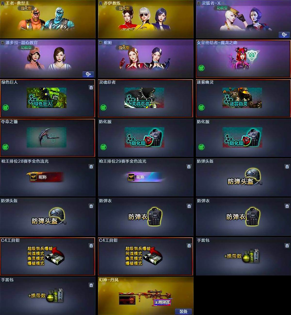 【道具】:女皇终结者-魔龙之吻,绿色巨人,灵魂忍者,迷雾幽灵,夺命之镰,防化服*2,枪王排位28赛季金色流光,枪王排位29赛季金色流光,防弹头盔*2,防弹衣*2,C4工具钳*2,手雷包*2