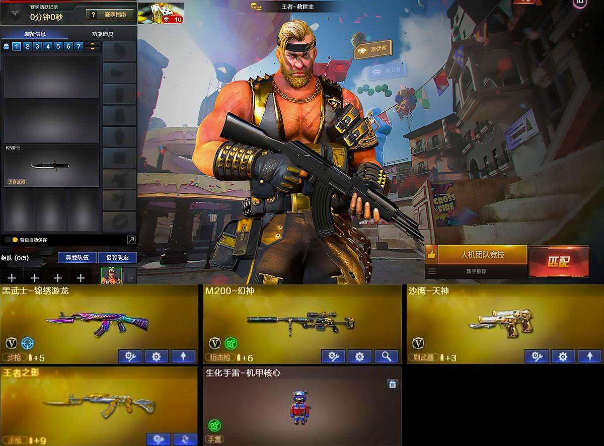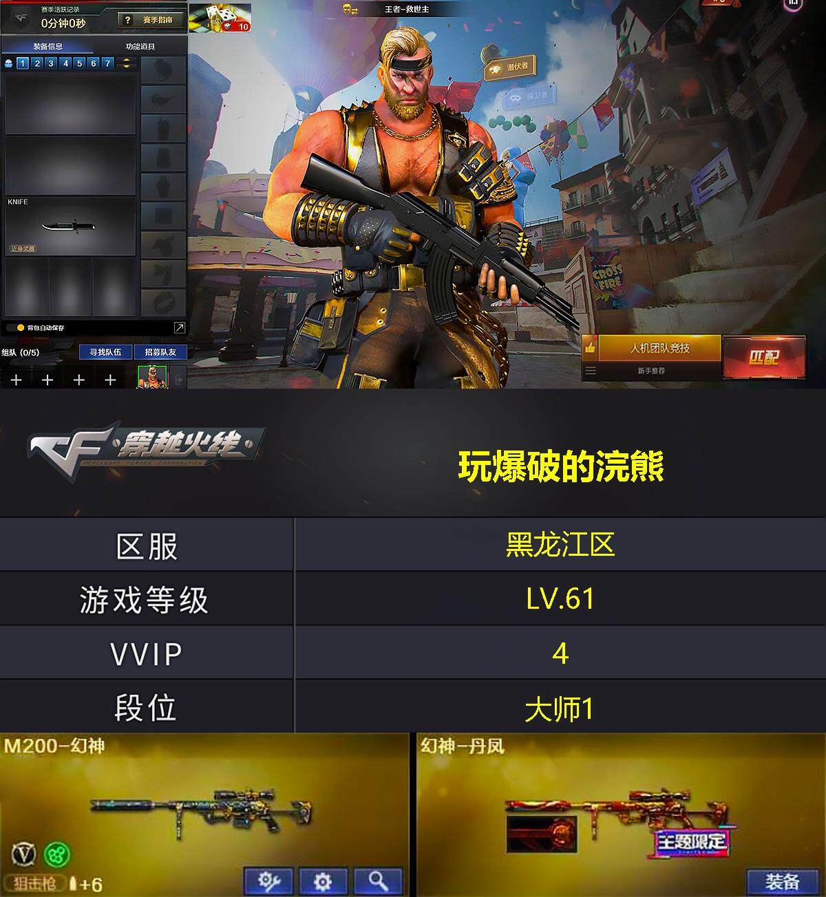 [13785942]黑龙江区-4V-2王者-0炫金 【热门武器】:M200-幻神 【王者炫金武器】:王者之影 【皮肤】:幻神-丹凤 【角色】:王者-救世主,乔伊教练,灵狐者-X,潘多拉-甜心教官,蛇姬 【人偶武器】:生化手雷-机甲核心 【英雄级武器】:黑武士-锦绣游龙,M200-幻神,沙鹰-天神 【道具】:女皇终结者-魔龙之吻,绿色巨人,灵魂忍者,迷雾幽灵,夺命之镰,防化服*2,枪王排位28赛季金色流光,枪王排位29赛季金色流光,防弹头盔*2,防弹衣*2,C4工具钳*2,手雷包*2 【特殊枪械】: