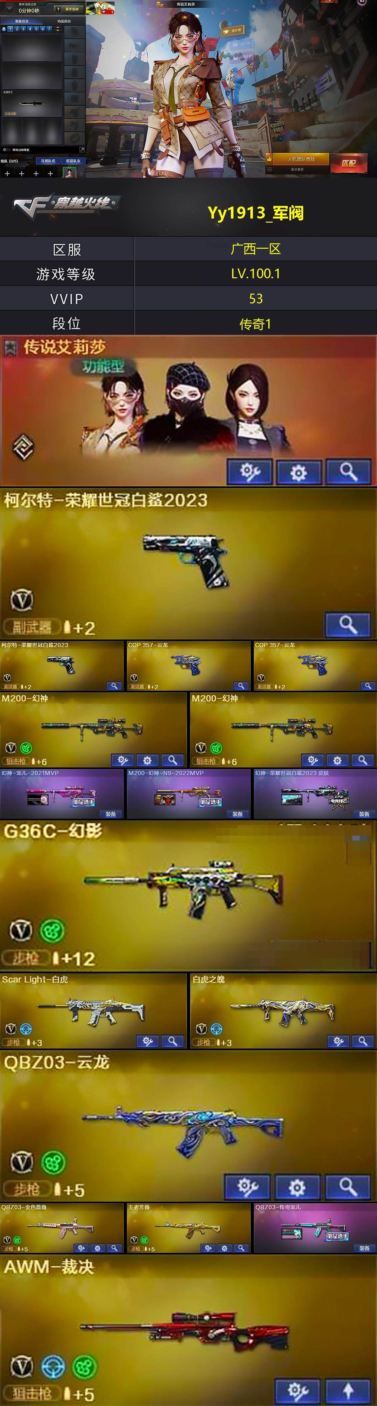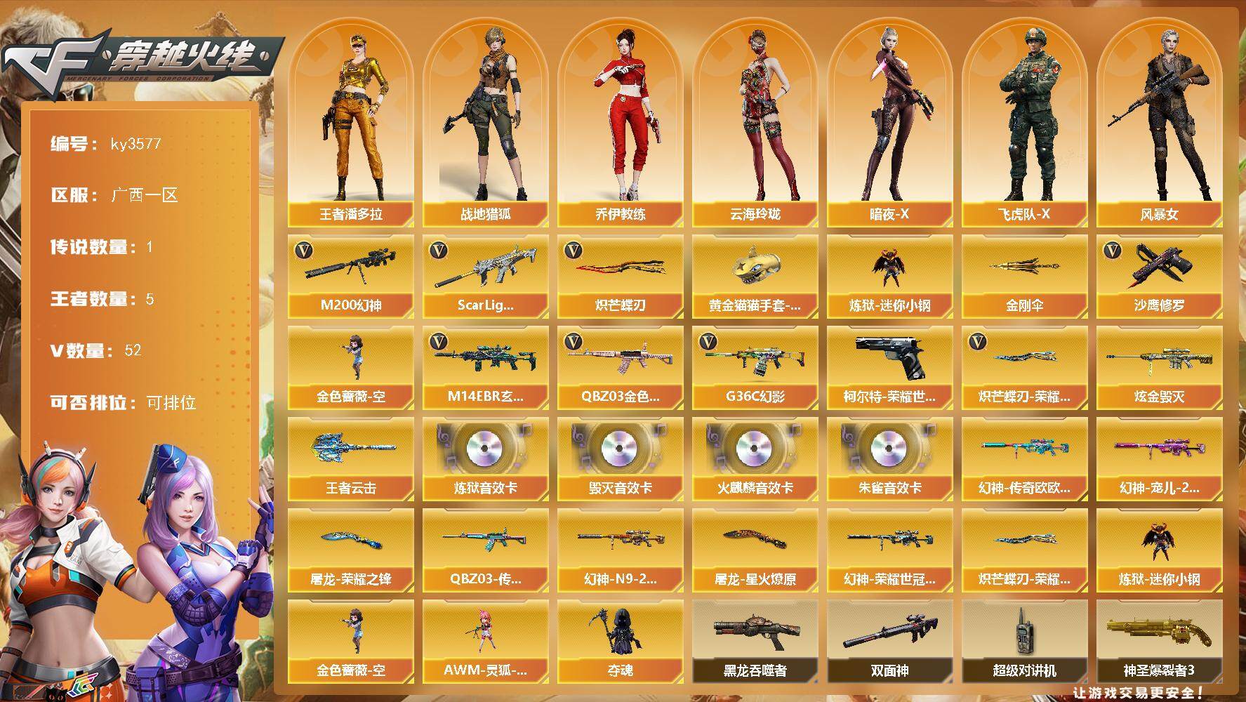 [13788172]广西一区-52V-5王者-1炫金 【传说角色】:传说艾莉莎 【热门武器】:G36C-幻影,QBZ03-金色蔷薇,M14EBR-玄武,Scar Light-白虎,M200-幻神*2,柯尔特-荣耀世冠白鲨2023*2,炼狱-迷你小钢,金色蔷薇-空,沙鹰-修罗*3,炽芒蝶刃,炽芒蝶刃-荣耀世冠白鲨2023 皮肤,黄金猫猫手套-白鲨,金刚伞 【王者炫金武器】:王者云击,炫金毁灭 【音效卡】:AK47-火麒麟音效卡,Barrett-毁灭音效卡,HK417-朱雀音效卡,加特林-炼狱音效卡 【皮肤】:幻神-宠儿-2021MVP,M200-幻神-N9-2022MVP,幻神-荣耀世冠白鲨2023 皮肤,幻神-传奇欧欧 皮肤,QBZ03-传奇宠儿,屠龙-荣耀之锋,屠龙-星火燎原,炽芒蝶刃-荣耀世冠白鲨2023 皮肤 【角色】:战地猎狐,王者潘多拉,乔伊教练,云海玲珑,暗夜-X,飞虎队-X,风暴女,嘉年华灵狐,娟娟,灵狐-花神,灵狐者-七夕宝贝,曼陀罗-X,曼陀罗-礼服,萌儿,潘多拉-X,蛇姬,斯沃特-X,游珑儿 【人偶武器】:炼狱-迷你小钢,金色蔷薇-空,AWM-灵狐-15周年嘉年华,夺魂 【暴走生化】:黑龙吞噬者,双面神,超级对讲机 【挑战大师】:神圣爆裂者III,冰龙粉碎者-白马银枪,机甲撕裂者III,神圣爆裂者-末日III 【英雄级武器】:AK47-火麒麟,AK12-天启,Scar Light-白虎,M14EBR-玄武,无影-神兵利器,G36C-幻影,QBZ03-云龙,黑武士-锦绣游龙,QBZ03-金色蔷薇,王者之势-觉醒版,白虎之魄-觉醒版,王者芳薇-觉醒版,Barrett-毁灭,Barrett-极光,AWM-裁决,M200-幻神*2,沙鹰-修罗*3,柯尔特-荣耀世冠白鲨2023*2,COP 357-云龙*2,屠龙*2,炽芒蝶刃,斩神刀-雷暴,高爆手雷-雷暴,高爆手雷-神工天巧*4,高爆手雷-云龙*2,手雷-云海游龙,闪光弹-雷暴,闪光弹-神工天巧*4,闪光弹-云龙*3,烟雾弹-雷暴,烟雾弹-神工天巧*4,烟雾弹-云龙*4,M4A1-赤狱骑士 【道具】:XROCK炫彩背包,云山科技背包,冰冰企鹅背包,古蛇迷踪炫彩背包,热带奇洋炫彩背包,超级背包,女皇终结者-魔龙之吻,救世主-黑桃战神,绿色巨人,灵魂忍者*2,变异宝贝,迷雾幽灵*2,生化弹匣,夺命之镰,防化服*3,金色流光-枪