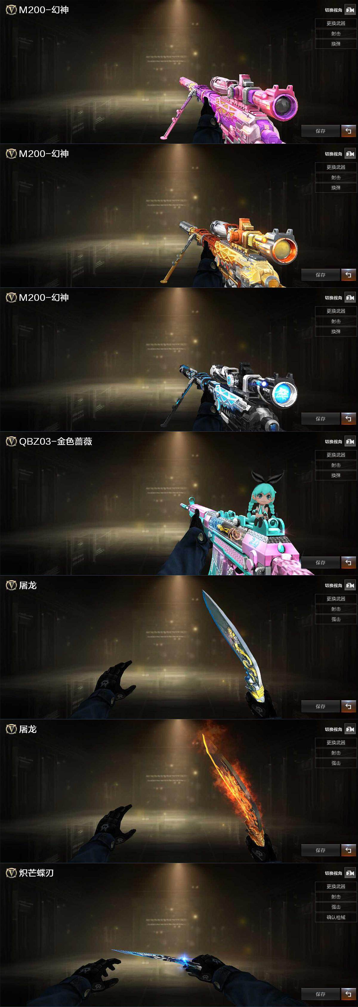 【皮肤】:幻神-宠儿-2021MVP,M200-幻神-N9-2022MVP,幻神-荣耀世冠白鲨2023 皮肤,幻神-传奇欧欧 皮肤,QBZ03-传奇宠儿,屠龙-荣耀之锋,屠龙-星火燎原,炽芒蝶刃-荣耀世冠白鲨2023 皮肤