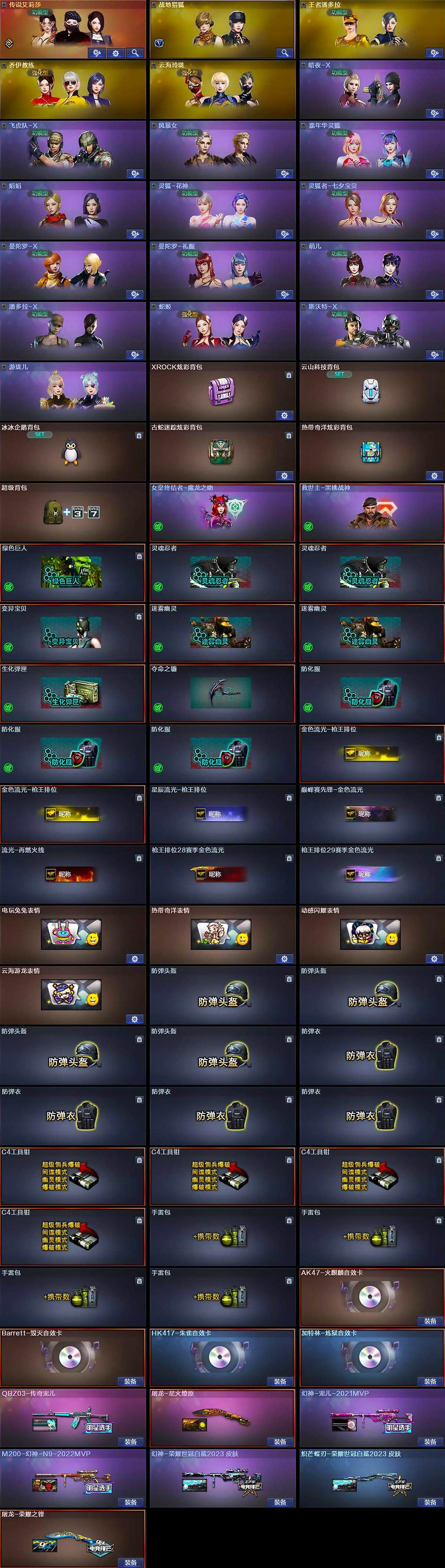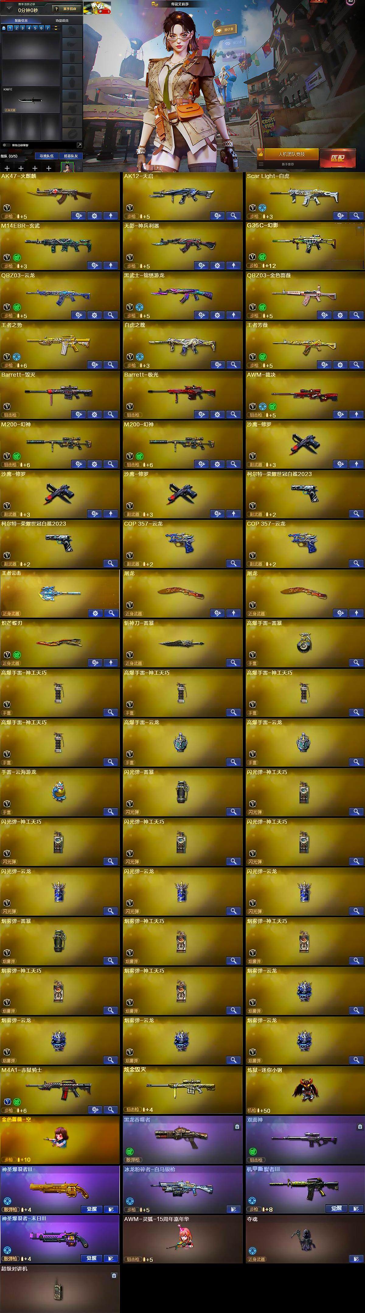 【英雄级武器】:AK47-火麒麟,AK12-天启,Scar Light-白虎,M14EBR-玄武,无影-神兵利器,G36C-幻影,QBZ03-云龙,黑武士-锦绣游龙,QBZ03-金色蔷薇,王者之势-觉醒版,白虎之魄-觉醒版,王者芳薇-觉醒版,Barrett-毁灭,Barrett-极光,AWM-裁决,M200-幻神*2,沙鹰-修罗*3,柯尔特-荣耀世冠白鲨2023*2,COP 357-云龙*2,屠龙*2,炽芒蝶刃,斩神刀-雷暴,高爆手雷-雷暴,高爆手雷-神工天巧*4,高爆手雷-云龙*2,手雷-云海游龙,闪光弹-雷暴,闪光弹-神工天巧*4,闪光弹-云龙*3,烟雾弹-雷暴,烟雾弹-神工天巧*4,烟雾弹-云龙*4,M4A1-赤狱骑士