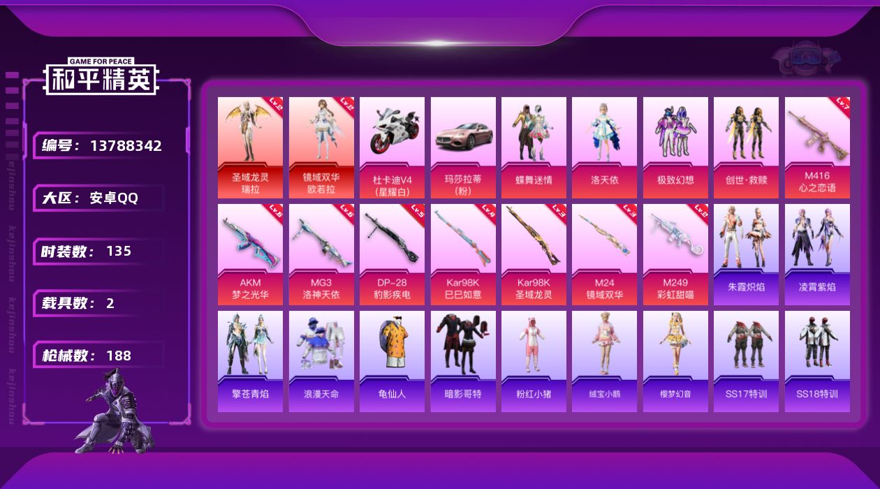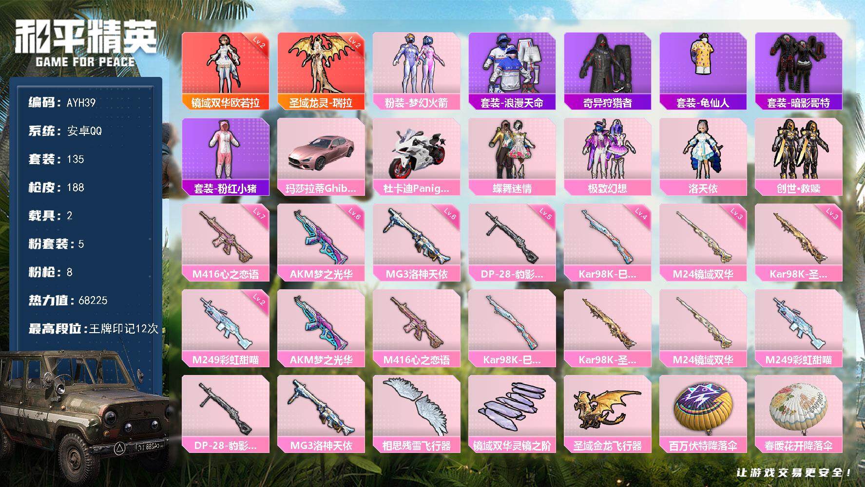 [13788342]【店主推荐捡漏号!可直接换绑安卓 手Q-2神装-5粉装-8特效枪-2载具-3粉色飞行器-68225热力值-12王牌印记-135套装-188枪皮【红色神装等级】:圣域龙灵-瑞拉(二级),镜域双华-欧若拉(二级)【红色角色神装】:圣域龙灵-瑞拉,镜域双华-欧若拉【热门品类】:粉装-梦幻火箭,套装-浪漫天命,套装-奇异狩猎者,套装-龟仙人,套装-暗影哥特,套装-粉红小猪【粉色载具】:玛莎拉蒂Ghibli(粉),杜卡迪 Panigale V4(星耀白)【粉色套装】:粉装-蝶舞迷情,粉装-梦幻火箭,粉装-极致幻想,角色-洛天依,套装-创世·救赎【粉色枪皮等级】:AKM-梦之光华(六级),M416-心之恋语(七级),Kar98K-巳巳如意(四级),Kar98K-圣域龙灵(三级),M24-镜域双华(三级),M249-彩虹甜喵(二级),DP-28-豹影疾电(五级),MG3-洛神天依(六级)【粉色枪皮】:AKM-梦之光华,M416-心之恋语,Kar98K-巳巳如意,Kar98K-圣域龙灵,M24-镜域双华,M249-彩虹甜喵,DP-28-豹影疾电,MG3-洛神天依【粉色飞行器】:相思残雪飞行器,镜域双华-灵镜之阶,圣域金龙飞行器
