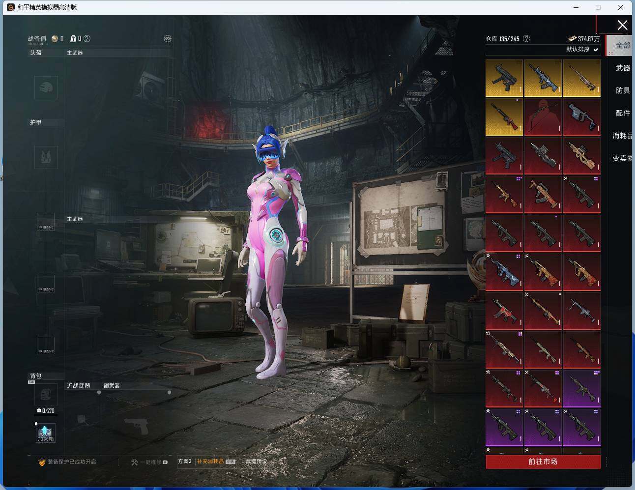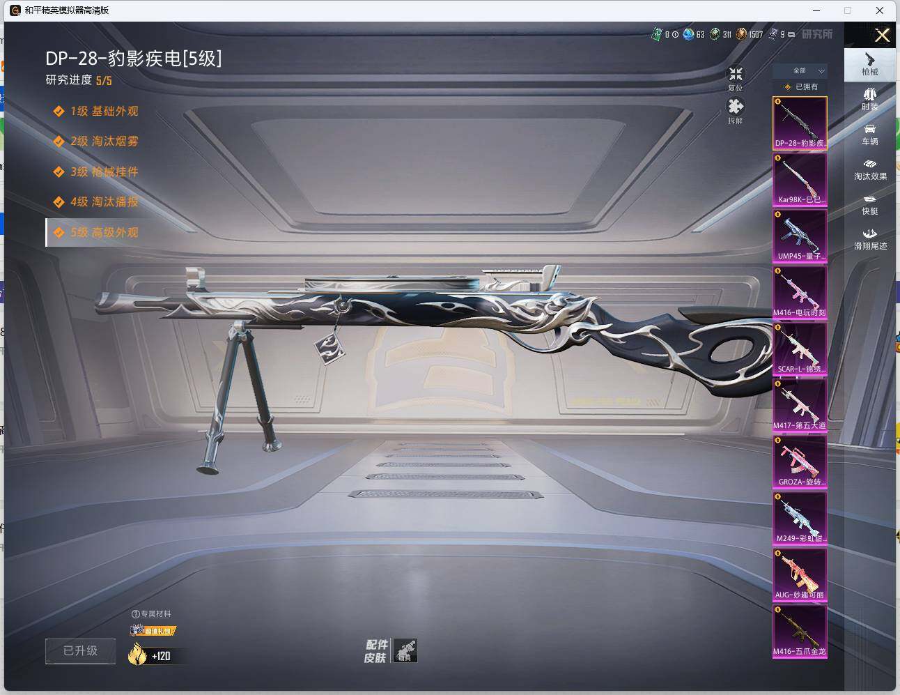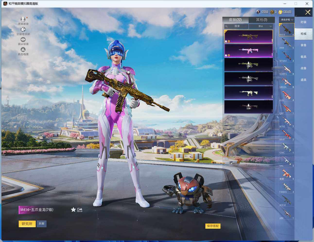 AKM-梦之光华,M416-心之恋语,Kar98K-巳巳如意,Kar98K-圣域龙灵,M24-镜域双华,M249-彩虹甜喵,MG3-洛神天依