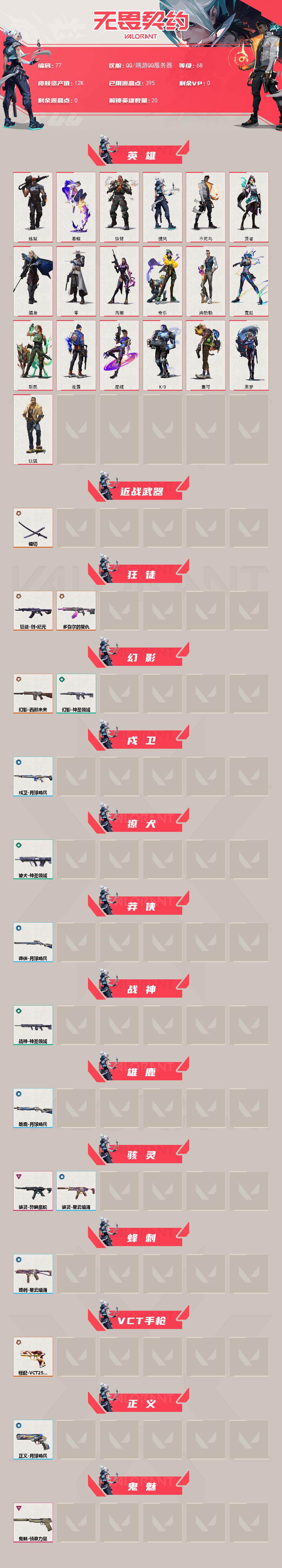 [13687331]【英雄】:炼狱,暮蝶,钛狐,铁臂,捷风,不死鸟,贤者,猎枭,零,芮娜,奇乐,尚勃勒,霓虹,斯凯,夜露,星礈,K/O,盖可,黑梦 【近战 武器】:近战武器-镭切 【狂徒】:狂徒-创·纪元,狂徒-多弥尔的复仇 【幻影】:幻影-西部未来,幻影-神圣领域,幻影-西部未来 【戍卫】:戍卫-月球哨兵 【獠犬】:獠犬-神圣领域 【莽侠】:莽侠-月球哨兵 【战神】:战神-神圣领域 【雄鹿】:雄鹿-月球哨兵 【骇灵】:骇灵-异鳞魔蛇,骇灵-星云暗涌 【蜂刺】:蜂刺-星云暗涌 【VCT手枪】:标配-VCT25 x EDG 【正义】:正义-月球哨兵 【鬼魅】:鬼魅-侦察力量 【狂怒】:狂怒-神圣领域 【卡面】:无畏契约GO!第一卷:零 卡面,代号红色 卡面,新兵报到 卡面,V契约 卡面,无畏契约 卡面 【喷漆】:买装还是存钱 喷漆,关门放狗 喷漆,暴走萝莉 喷漆,胜利属于无畏契约 喷漆,GLHF 喷漆,无畏契约 喷漆 【挂饰】:VCT x EDG 挂饰,无畏契约 纪念币 挂饰