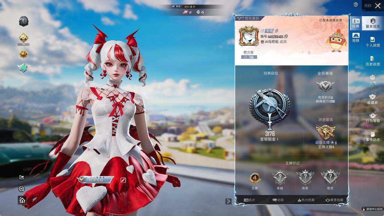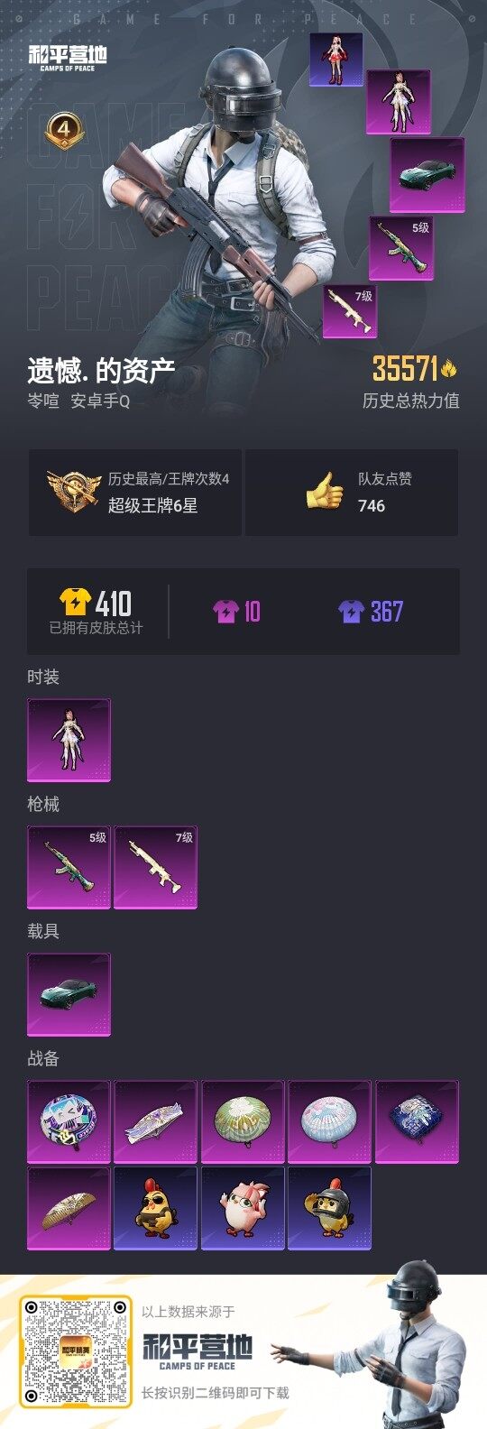 - [12946711]【暑期末清货/特价急出/永久包赔】:安卓 手Q-6粉装-7特效枪-2载具-4.9w热力值-5印记-121套装-164枪皮【热门品类】:M416-星际漫游【稀有载具】:路特斯ELETRE(冰川蓝),合金龙骨(蓝)【特效枪等级】:UZI-绮梦青鸾(五级),UMP45-恐龙拽拽(六级),汤姆逊-热量炸弹(五级),Kar98K-巳巳如意(五级),Mk14-甜梦熊击(五级),DP-28-豹影疾电(五级),MG-36-幻彩电音(五级)【优质套装】:粉装-梦幻火箭,粉装-天禅智恒,粉装-彗云及圣,粉装-炙焰红王,粉装-天之羽翼,角色-绯穹魔姬【优质飞行器】:梦幻火箭飞行器,天之羽翼飞行器