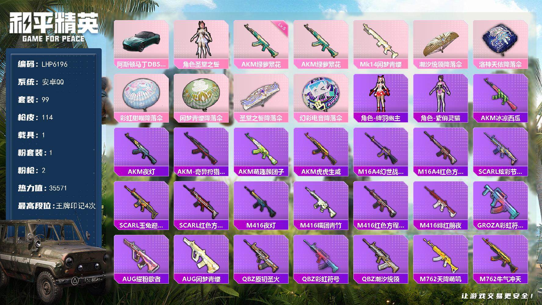 [13789062]【店主推荐捡漏号!可直接换绑】 安卓 手Q-1粉装-2特效枪-1载具-3.5w热力值-4王牌印记-99套装-114枪皮【粉色载具】:阿斯顿马丁DBS(绿)【粉色套装】:角色-圣堂之誓【粉色枪皮等级】:AKM-绿萝繁花(五级)