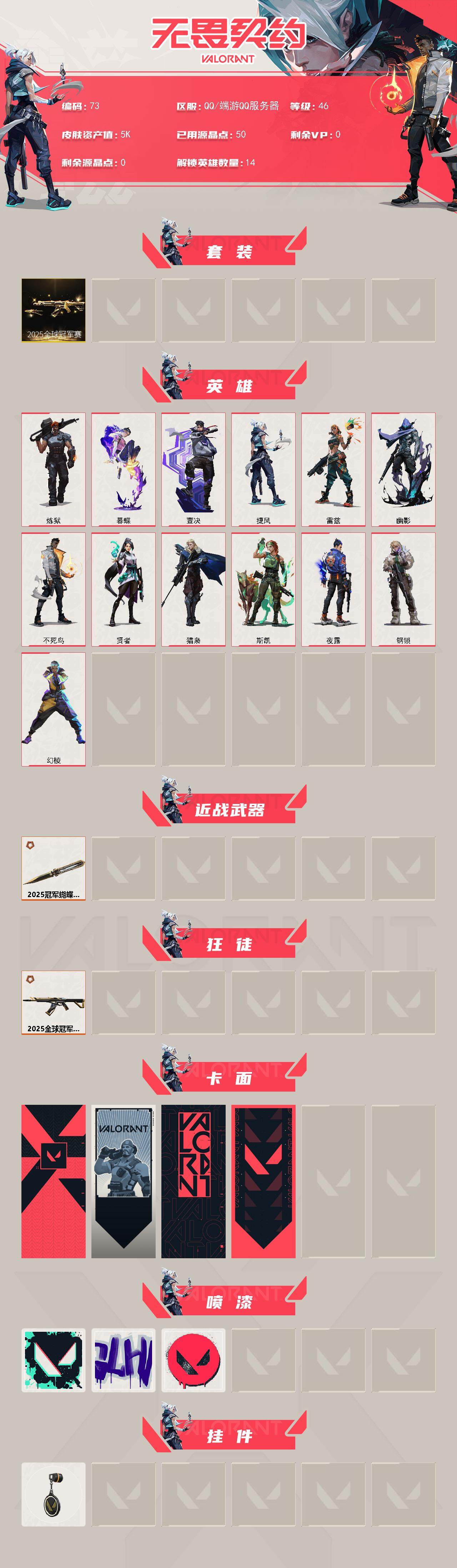 - [12940064]【英雄】:幻棱,炼狱,维斯,暮蝶,钛狐,壹决,铁臂,捷风,雷兹,幽影,不死鸟,贤者,猎枭,蝰蛇,零,芮娜,奇乐,尚勃勒,霓虹,斯凯,夜露,星礈,K/O,海神,盖可,黑梦,钢锁 【近战 武器】:近战武器-威龙之刃,近战武器-澄湖潋滟 【狂徒】:狂徒-2025全球冠军赛,狂徒-洪荒怒焰,狂徒-盖亚的复仇,狂徒-弧光异彩 【幻影】:幻影-砰砰X特攻队,幻影-噬源兽防卫工程 【戍卫】:戍卫-掠影,戍卫-彩梦之城 【獠犬】:獠犬-弧光异彩 【冥驹】:冥驹-起源 【飞将】:飞将-信手涂鸦 【奥丁】:奥丁-信手涂鸦 【雄鹿】:雄鹿-彩梦之城 【骇灵】:骇灵-无限竞技,骇灵-信手涂鸦 【蜂刺】:蜂刺-弧光异彩 【标配】:标配-超能偶像,标配-彩梦之城 【正义】:正义-奇点,正义-超限闪存,正义-沙尘幻旅,正义-复古浪潮,正义-纳米打击 【鬼魅】:鬼魅-流星兵团,鬼魅-诡秘蛇影,鬼魅-光导纤维,鬼魅-信手涂鸦,鬼魅-星云暗涌 【狂怒】:狂怒-火线狂怒 【卡面】:终章:激斗汉堡 卡面,进入射程 卡面,《双城之战》拥抱 卡面,精灵大战 卡面,欢迎来到底城 卡面,南瓜盛典 卡面,VCT CN首冠 卡面,修车达人 卡面,热舞环节 卡面,超限闪存 卡面,正义的化身 卡面,终章:生意人麦宝 卡面,铁之华 卡面,时间到 卡面,最高舞台 卡面,声感陷阱设计图 卡面,红鳞松叶 卡面,Clutch 卡面,梦幻奶茶 卡面,终章:打造专属狂徒 卡面,趁热吃 卡面,源能反应 卡面,零点嗅探设计图 卡面,终章:瓦娃脸雪糕 卡面,表象之下 卡面,虹吸式咖啡壶 卡面,沙雕爆能器 卡面,无畏契约GO!第一卷:芮娜 卡面,清除名单 卡面,无畏契约GO!第一卷:零 卡面,终章:同步耍酷 卡面,龍记 卡面,化茧成蝶 卡面,《双城之战》金克丝 卡面,完美调谐 卡面 ,暗枪 卡面,铁臂vs雷兹 卡面,钢锁vs盖可 卡面,别冒尖 卡面,夯实根基 卡面,热烈欢迎 卡面,铁臂设计图 卡面,代号红色 卡面,冰淇淋店 卡面,新兵报到 卡面,友军火力 卡面,V契约 卡面,无畏契约 卡面 【喷漆】:嗨宝南瓜灯 喷漆,嘭! 喷漆,都算到了 喷漆,控场勿近 喷漆,小丑猫 喷漆,熊抱 喷漆,蛋糕还是爆能器? 喷漆,超级粉丝 喷漆,捷风差距 喷漆,惊声尖叫 喷漆,2021冠军巡回赛花火 喷漆,拼一枪 喷漆,我觉得不行 喷漆,我的刀呢? 喷漆,纤云