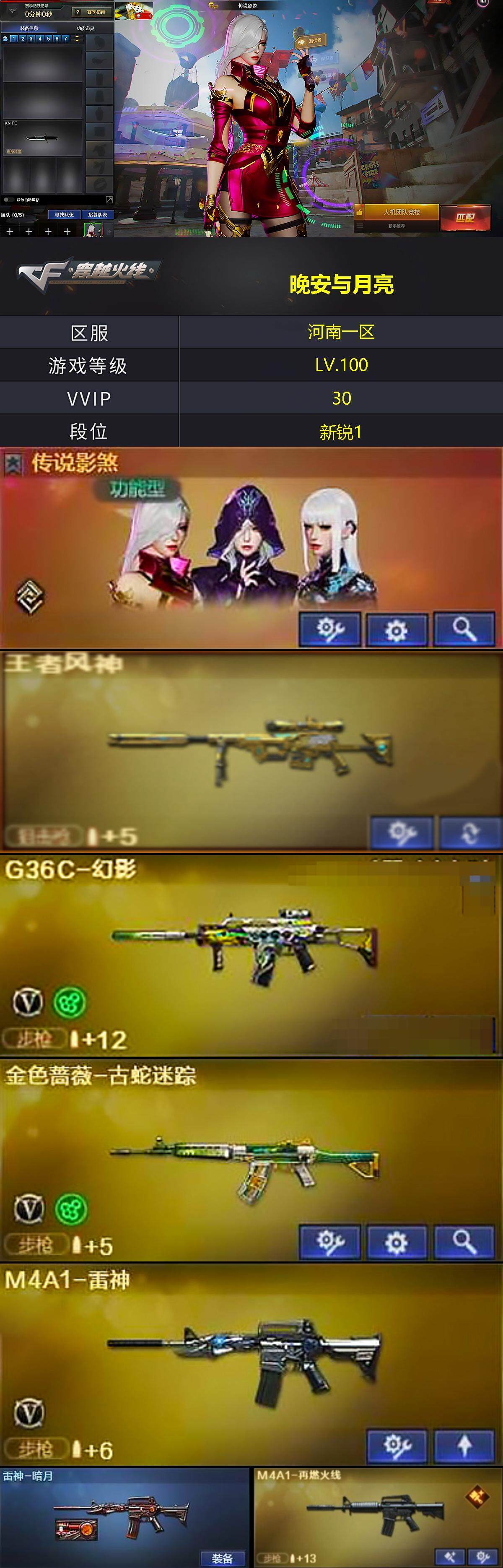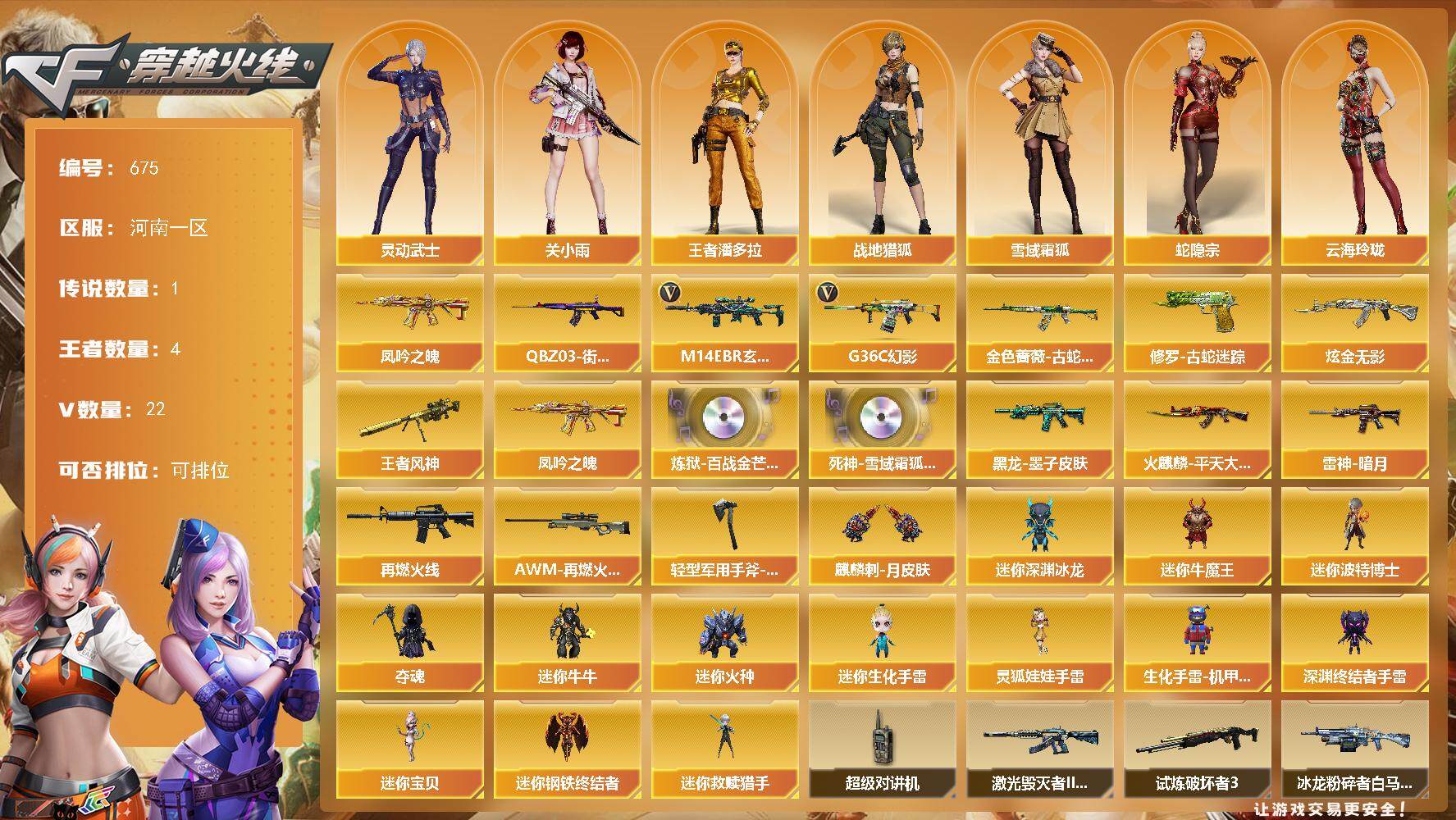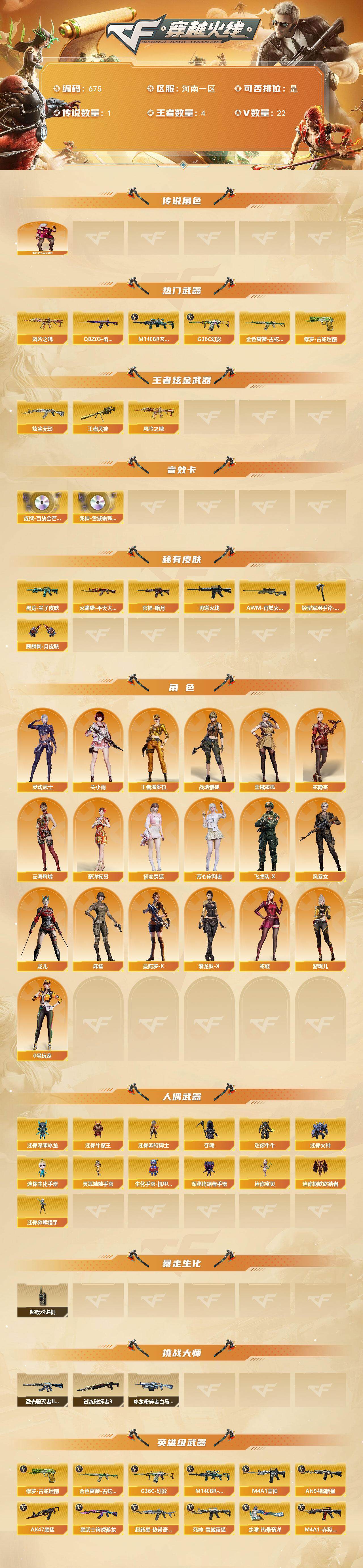 [13710291]河南一区-22V-4王者-1炫金 【传说角色】:传说影煞 【热门武器】:G36C-幻影,M14EBR-玄武,金色蔷薇-古蛇迷踪,修罗-古蛇迷踪,凤吟之魄,QBZ03-街机 【王者炫金武器】:凤吟之魄,王者风神,炫金无影 【音效卡】:炼狱-百战金芒-庆典舞曲音效卡,死神-雪域霜狐-怀旧音效卡 【皮肤】:雷神-暗月,M4A1-再燃火线,火麒麟-平天大圣,黑龙-墨子皮肤,AWM-再燃火线,轻型军用手斧-再燃火线,麒麟刺-月皮肤 【角色】:关小雨,战地猎狐,王者潘多拉,雪域霜狐,蛇隐宗,奇洋探员,云海玲珑,初恋灵狐,芳心审判者,飞虎队-X,风暴女,0号玩家,灵动武士,龙儿,麻雀,曼陀罗-X,潜龙队-X,蛇姬,游珑儿 【人偶武器】:迷你宝贝,迷你钢铁终结者,迷你救赎猎手,迷你深渊冰龙,迷你牛魔王,迷你波特博士,夺魂,迷你牛牛*2,迷你火种,迷你生化手雷,生化手雷-机甲核心*2,深渊终结者手雷,灵狐娃娃手雷 【暴走生化】:超级对讲机 【挑战大师】:冰龙粉碎者-白马银枪,激光毁灭者III-白马银枪*2,试炼破坏者III 【英雄级武器】:M4A1-雷神,AN94-超新星,AK47-黑鲨,M14EBR-玄武,G36C-幻影,黑武士-锦绣游龙,超新星-热带奇洋,金色蔷薇-古蛇迷踪,死神-雪域霜狐,炼狱-百战金芒,修罗-古蛇迷踪,龙啸-热带奇洋,麒麟刺-百战金芒,丛林匕首-玄豹,手雷-热带奇洋,高爆手雷-古蛇迷踪,高爆手雷-玄豹,闪光弹-玄豹*2,烟雾弹-古蛇迷踪,烟雾弹-玄豹,M4A1-赤狱骑士,M4A1-苍鸣雷神 【道具】:BS战队炫彩背包,CFS限定背包,云山科技背包,亚洲杯纪念炫彩背包,古蛇迷踪炫彩背包,奇洋探员-海龟背包,热带奇洋炫彩背包,百战金芒炫彩背包,超级背包,雪域霜狐炫彩背包,女皇终结者-魔龙之吻,救世主-黑桃战神,绿色巨人,灵魂忍者*2,变异宝贝,妖姬,迷雾幽灵*2,生化弹匣,夺命之镰,防化服*3,金色流光-枪王排位,星辰流光-枪王排位,枪王排位29赛季金色流光,语音特效-盛典烟火,语音特效-怀旧,古蛇迷踪打击特效,雪域霜狐表情,蛇隐宗表情,萌萌小葵表情,热带奇洋表情,EP战队名片,EP战队喷图,EP战队击杀图标,防弹头盔*3,防弹衣*3,C4工具钳*3,手雷包*3 【特殊枪械】: