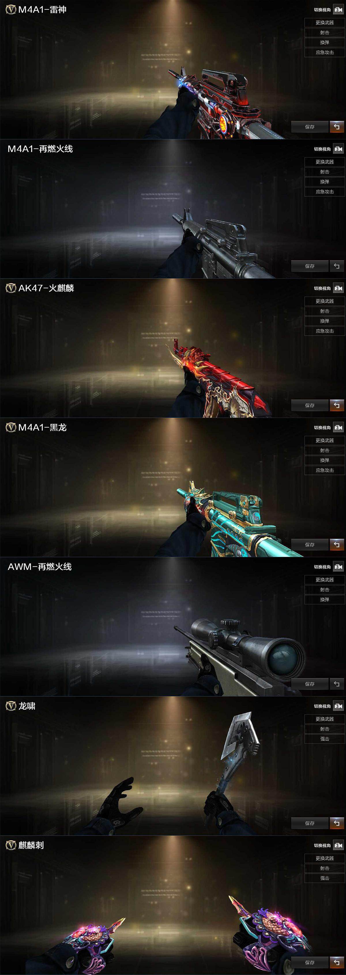 【英雄级武器】:M4A1-雷神,AN94-超新星,AK47-黑鲨,M14EBR-玄武,G36C-幻影,黑武士-锦绣游龙,超新星-热带奇洋,金色蔷薇-古蛇迷踪,死神-雪域霜狐,炼狱-百战金芒,修罗-古蛇迷踪,龙啸-热带奇洋,麒麟刺-百战金芒,丛林匕首-玄豹,手雷-热带奇洋,高爆手雷-古蛇迷踪,高爆手雷-玄豹,闪光弹-玄豹*2,烟雾弹-古蛇迷踪,烟雾弹-玄豹,M4A1-赤狱骑士,M4A1-苍鸣雷神