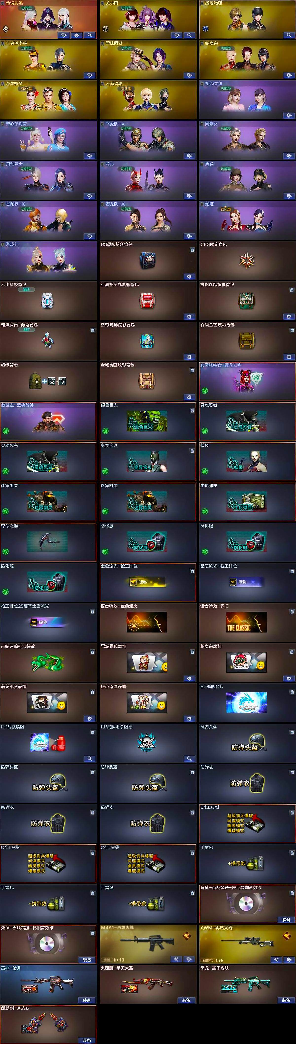 【道具】:BS战队炫彩背包,CFS限定背包,云山科技背包,亚洲杯纪念炫彩背包,古蛇迷踪炫彩背包,奇洋探员-海龟背包,热带奇洋炫彩背包,百战金芒炫彩背包,超级背包,雪域霜狐炫彩背包,女皇终结者-魔龙之吻,救世主-黑桃战神,绿色巨人,灵魂忍者*2,变异宝贝,妖姬,迷雾幽灵*2,生化弹匣,夺命之镰,防化服*3,金色流光-枪王排位,星辰流光-枪王排位,枪王排位29赛季金色流光,语音特效-盛典烟火,语音特效-怀旧,古蛇迷踪打击特效,雪域霜狐表情,蛇隐宗表情,萌萌小葵表情,热带奇洋表情,EP战队名片,EP战队喷图,EP战队击杀图标,防弹头盔*3,防弹衣*3,C4工具钳*3,手雷包*3