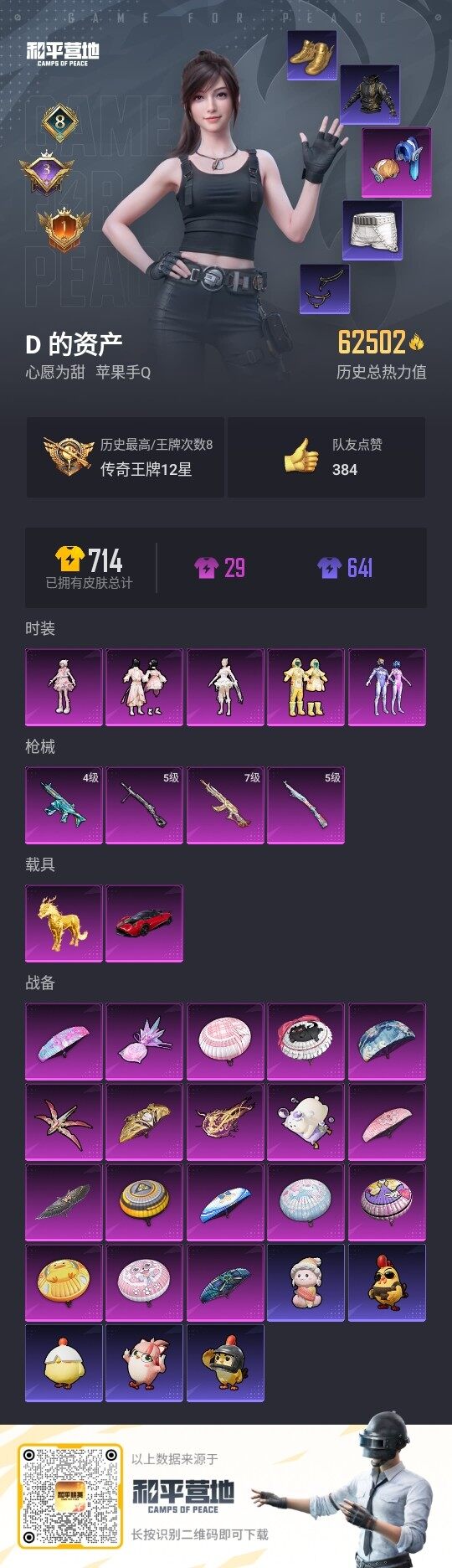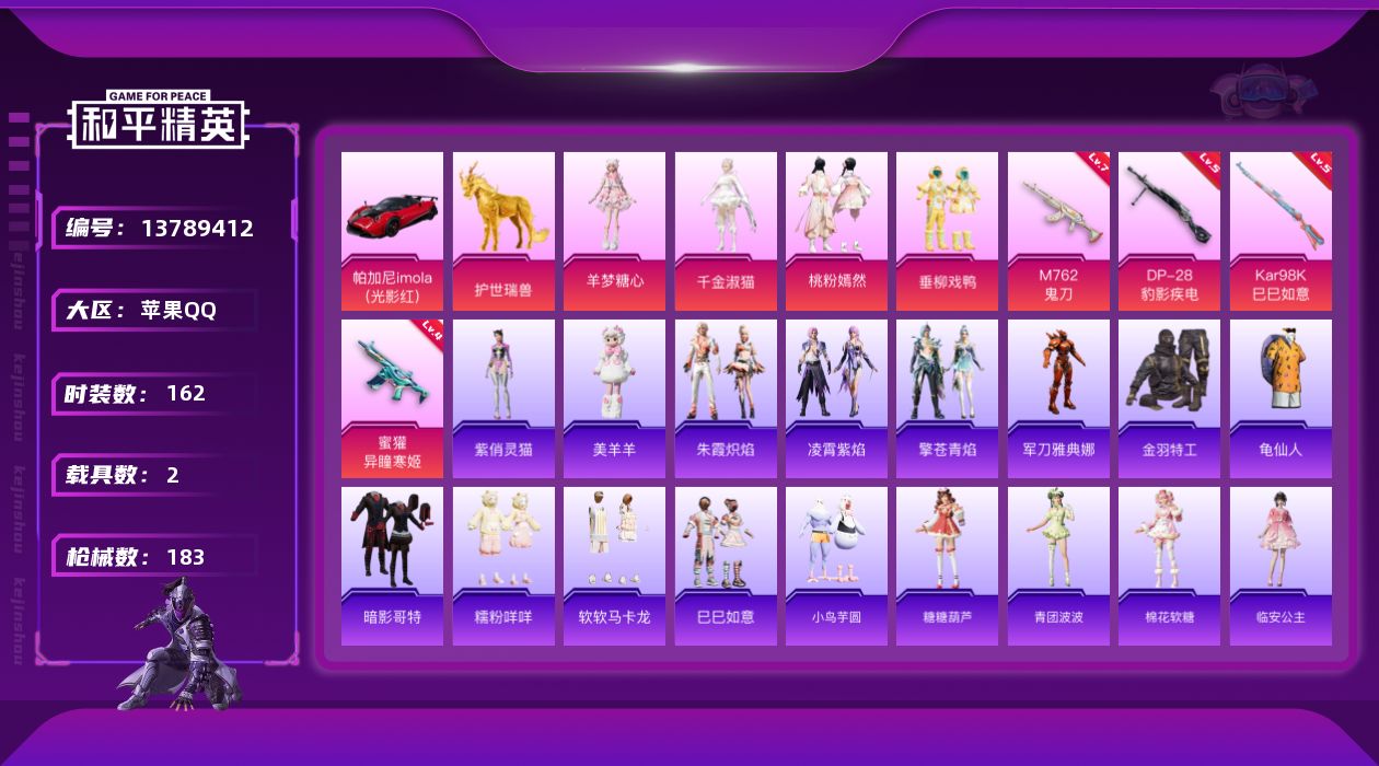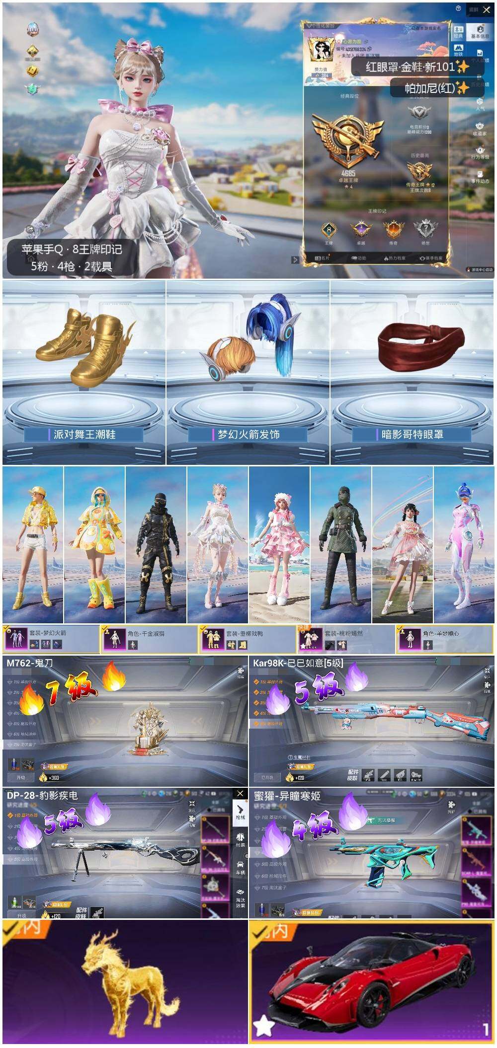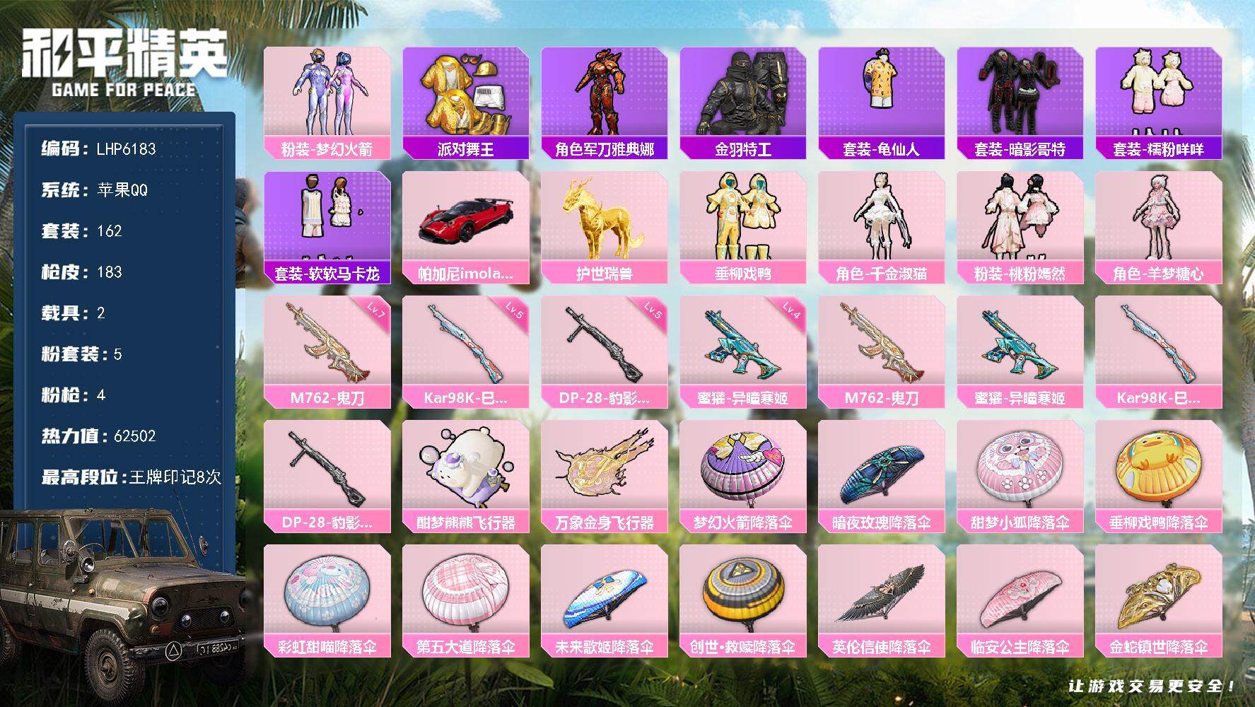 [13789412]可二次【店主推荐捡漏号!可直接换绑】 苹果 手Q-5粉装-4特效枪-2载具-4粉色飞行器-6.2w热力值-8王牌印记-162套装-183枪皮【热门品类】:粉装-梦幻火箭,套装-派对舞王,角色-军刀雅典娜,套装-金羽特工,套装-龟仙人,套装-暗影哥特,套装-糯粉咩咩,套装-软软马卡龙【粉色载具】:帕加尼imola(光影红),护世瑞兽【粉色套装】:粉装-梦幻火箭,粉装-垂柳戏鸭,角色-千金淑猫,粉装-桃粉嫣然,角色-羊梦糖心【粉色枪皮等级】:M762-鬼刀(七级),蜜獾-异瞳寒姬(四级),Kar98K-巳巳如意(五级),DP-28-豹影疾电(五级)【粉色飞行器】:酣梦熊熊飞行器,万象金身飞行器