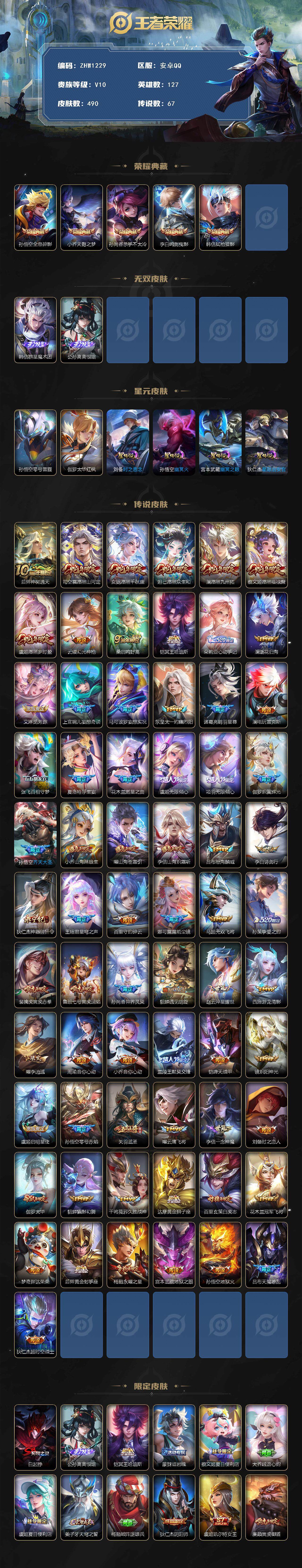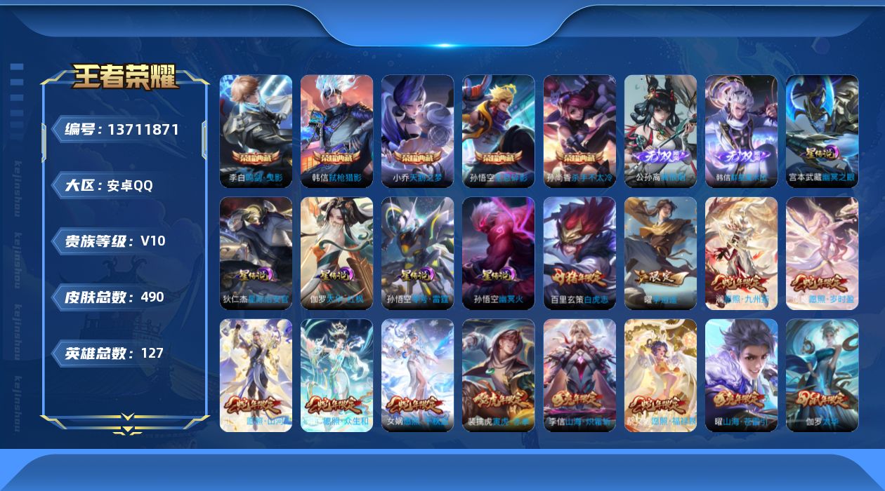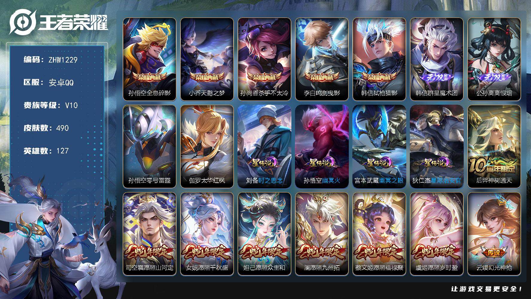 [13711871]【店主推荐捡漏号!可直接换绑,背包一颗水晶】安卓Q-V10-最强王者段位-127英雄-490皮肤-5典藏-2无双-67传说-154史诗 【英雄全皮】:刘邦全皮,孙权全皮,娜可露露全皮,孙悟空全皮,钟馗全皮,鬼谷子全皮,黄忠全皮,李信全皮,盾山全皮,猪八戒全皮,鲁班大师全皮,蒙恬全皮,澜全皮,司空震全皮,金蝉全皮,影全皮 【荣耀典藏】:孙悟空全息碎影,小乔天鹅之梦,孙尚香杀手不太冷,李白鸣剑曳影,韩信弑枪猎影 【无双皮肤】:韩信群星魔术团,公孙离离恨烟 【传说皮肤】:后羿神树通天,司空震愿照山河定,女娲愿照千秋盛,妲己愿照众生和,澜愿照九州拓,蔡文姬愿照福禄聚,虞姬愿照岁时盈,云缨幻光神枪,桑启鸣野蒿,铠冥王哈迪斯,朵莉亚心动手记,澜逐花归海,艾琳觅芳踪,上官婉儿妄想奇谈,马可波罗妄想实况,东皇太一灼幽烈阳,诸葛亮鹤羽星尊,澜电玩雷克斯,张飞百相守梦,夏洛特浮生妄,花木兰燃星之曲,虞姬无限倾心,项羽无限倾心,伽罗炽翼辉光,孙悟空齐天大圣,小乔山海琳琅生,曜山海苍雷引,李信山海炽霜斩,吕布怒海麟威,李白诗剑行,狄仁杰神器狴犴令,王昭君星穹之声,百里守约碎云,娜可露露前尘镜,马超无双飞将,孙策挚爱之约,裴擒虎寅虎赤拳,鲁班七号寅虎瑞焰,孙尚香异界灵契,貂蝉遇见胡旋,赵云淬星耀世,西施游龙清影,曜李逍遥 ,周瑜音你心动,小乔音你心动,兰陵王默契交锋,铠绛天战甲,镜炽阳神光,虞姬启明星使,孙悟空零号赤焰,关羽武圣,曜云鹰飞将,李信一念神魔,刘备时之恋人,伽罗太华,貂蝉猫影幻舞,干将莫邪久胜战神,达摩黄金狮子座,百里玄策白虎志,花木兰冠军飞将,梦奇胖达荣荣,后羿黄金射手座,杨戬永曜之星,宫本武藏地狱之眼,孙悟空地狱火,吕布天魔缭乱,狄仁杰超时空战士 【限定皮肤】:白起狰,公孙离离恨烟,铠冥王哈迪斯,蒙犽顽岩魄,蔡文姬夏日便利店,大乔绒语心约,虞姬夏日便利店,姜子牙天穹之誓,杨戬破阵退雄兵,狄仁杰阴阳师,虞姬凯尔特女王,廉颇寅虎御盾,小乔山海琳琅生,赵云皇家上将,赵云引擎之心,赵云龙胆,赵云百木心枪,墨子神迹守卫,嬴政优雅恋人,孙尚香异界灵契,鲁班七号乒乒小将,鲁班七号寅虎瑞焰,庄周高山流水,阿轲迷踪丽影,钟无艳超时空战士,孙膑妖精王,孙膑天狼运算者,孙膑寅虎展翼,扁鹊炼金王,扁鹊奇幻香踪,白起夜都怪侠,芈月重明,芈月白晶晶,芈月幻夜卜梦,吕布天魔缭乱,吕布御风骁将,元歌云间偶