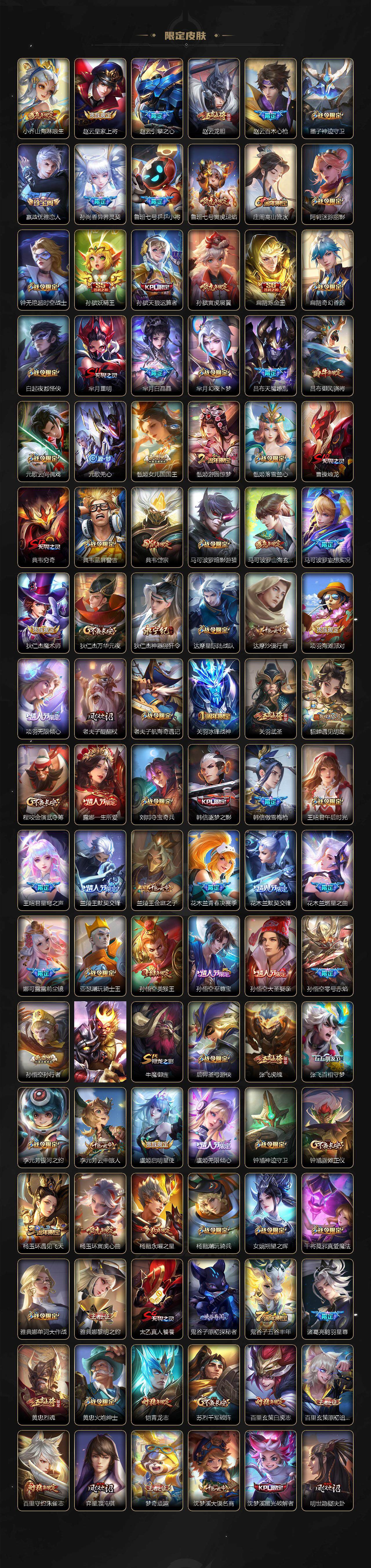 【限定皮肤】:白起狰,公孙离离恨烟,铠冥王哈迪斯,蒙犽顽岩魄,蔡文姬夏日便利店,大乔绒语心约,虞姬夏日便利店,姜子牙天穹之誓,杨戬破阵退雄兵,狄仁杰阴阳师,虞姬凯尔特女王,廉颇寅虎御盾,小乔山海琳琅生,赵云皇家上将,赵云引擎之心,赵云龙胆,赵云百木心枪,墨子神迹守卫,嬴政优雅恋人,孙尚香异界灵契,鲁班七号乒乒小将,鲁班七号寅虎瑞焰,庄周高山流水,阿轲迷踪丽影,钟无艳超时空战士,孙膑妖精王,孙膑天狼运算者,孙膑寅虎展翼,扁鹊炼金王,扁鹊奇幻香踪,白起夜都怪侠,芈月重明,芈月白晶晶,芈月幻夜卜梦,吕布天魔缭乱,吕布御风骁将,元歌云间偶