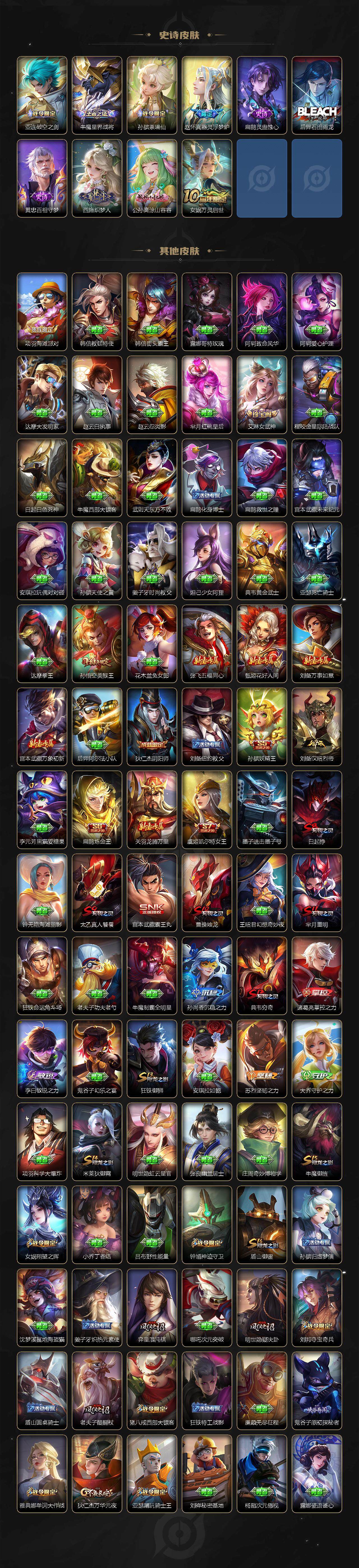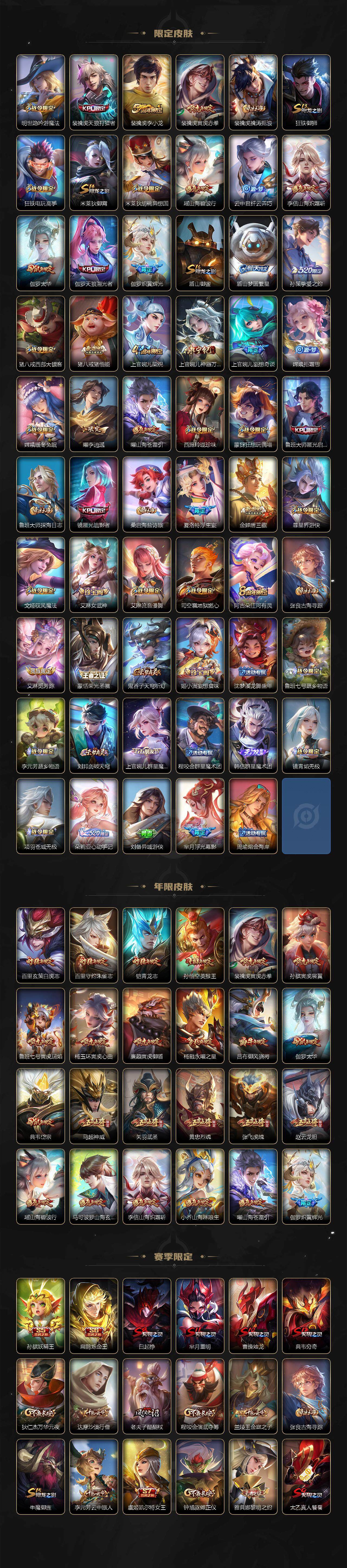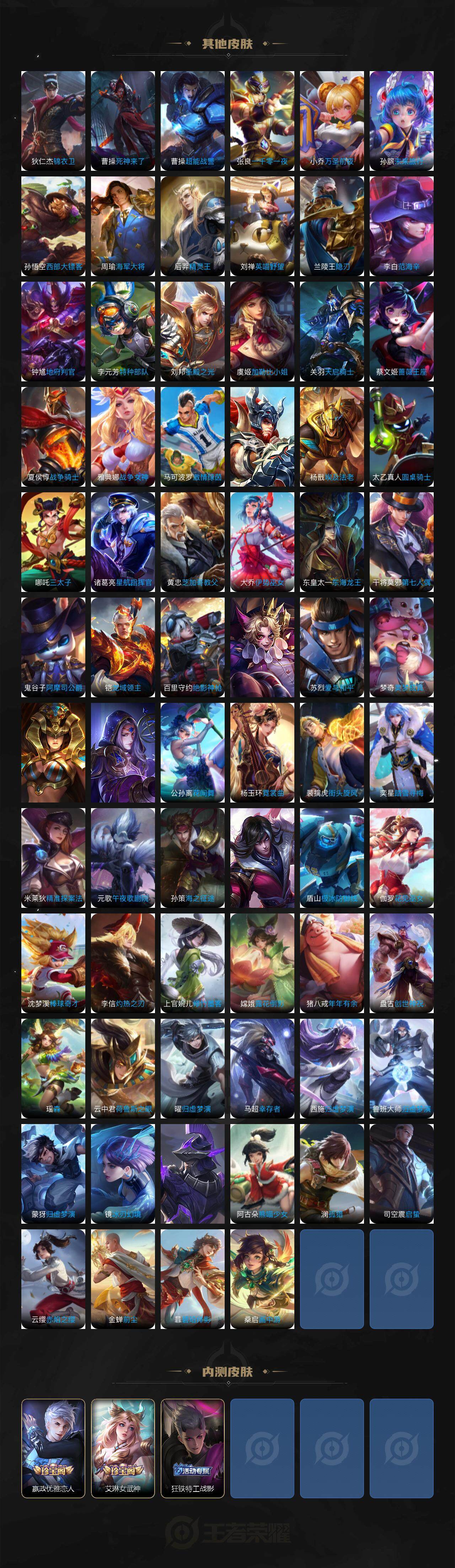 关羽冰锋战神,裴擒虎李小龙,上官婉儿梁祝,吕布御风骁将,赵云龙胆,关羽武圣,黄忠烈魂,张飞虎魄,马超神威,典韦岱宗,伽罗太华,裴擒虎天狼狩猎者,孙膑天狼运算者,伽罗天狼溯光者,韩信逐梦之影,铠青龙志,百里玄策白虎志,百里守约朱雀志,孙悟空大圣娶亲,露娜一生所爱,花木兰默契交锋,兰陵王默契交锋,孙悟空至尊宝,雅典娜神奇女侠,花木兰青春决赛季,芈月白晶晶,赵云引擎之心,孙悟空美猴王,鲁班七号乒乒小将,猪八戒猪悟能,廉颇寅虎·御盾,孙尚香异界灵契,孙悟空孙行者,甄姬女儿国国王,镜匿光追影者,韩信傲雪梅枪,鲁班七号寅虎·瑞焰,孙膑寅虎·展翼,杨玉环寅虎·心曲,裴擒虎寅虎·赤拳,赵云百木心枪,金蝉唐三藏,娜可露露前尘镜,鲁班大师匿光启智者,王昭君星穹之声,上官婉儿神器·万象笔,盾山梦圆繁星,李白诗剑行,马可波罗山海·玄木吟,瑶山海·碧波行,桑启鸣野蒿,澜愿照·九州拓,蔡文姬愿照·福禄聚,虞姬愿照·岁时盈,司空震愿照·山河定,妲己愿照·众生和,女娲愿照·千秋盛