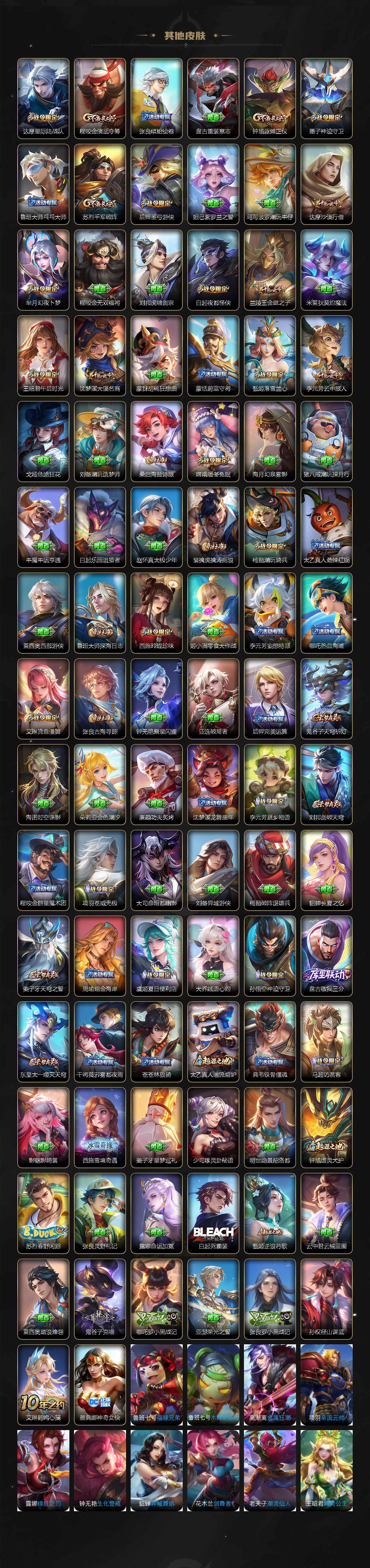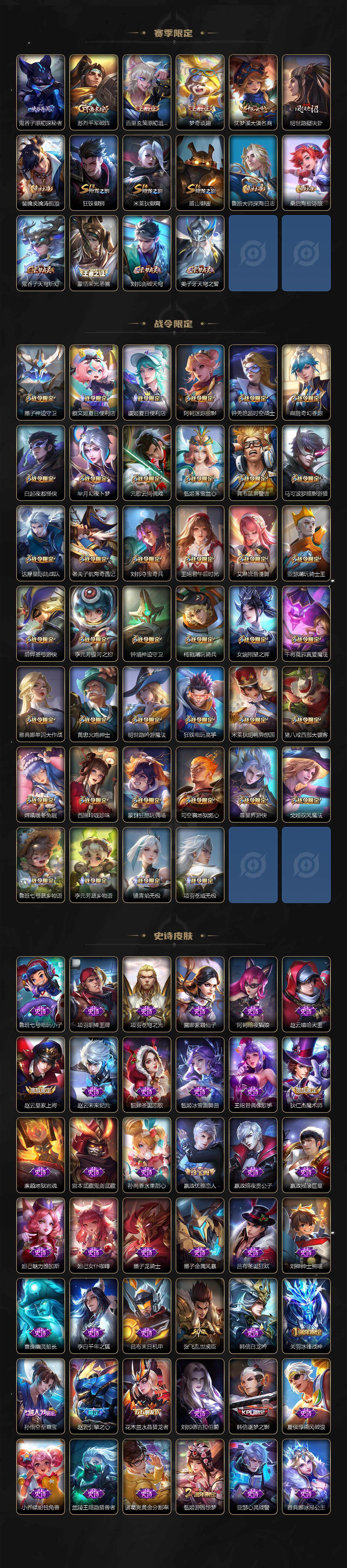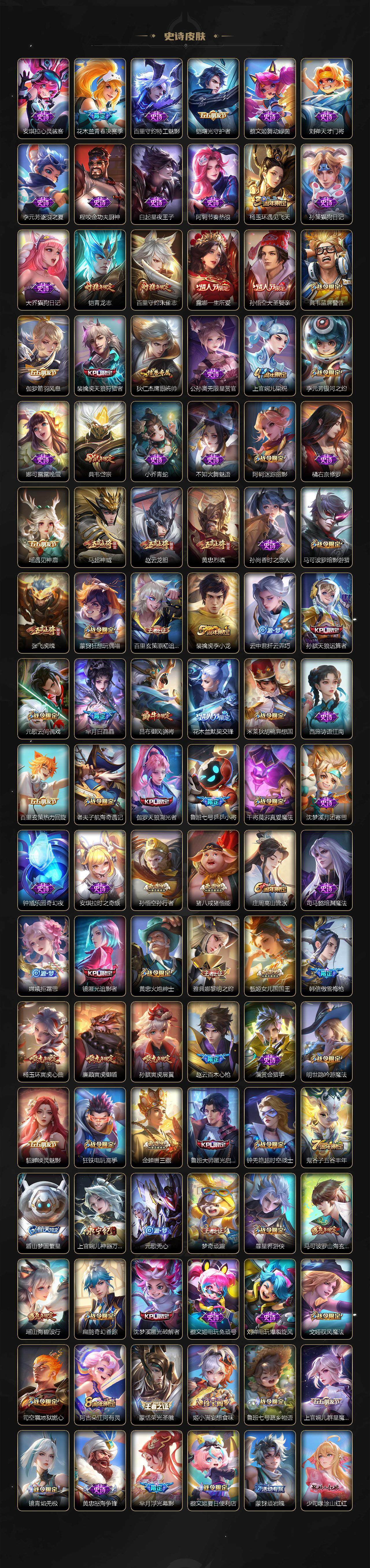 关羽冰锋战神,裴擒虎李小龙,上官婉儿梁祝,吕布御风骁将,赵云龙胆,关羽武圣,黄忠烈魂,张飞虎魄,马超神威,典韦岱宗,伽罗太华,裴擒虎天狼狩猎者,孙膑天狼运算者,伽罗天狼溯光者,韩信逐梦之影,铠青龙志,百里玄策白虎志,百里守约朱雀志,孙悟空大圣娶亲,露娜一生所爱,花木兰默契交锋,兰陵王默契交锋,孙悟空至尊宝,雅典娜神奇女侠,花木兰青春决赛季,芈月白晶晶,赵云引擎之心,孙悟空美猴王,鲁班七号乒乒小将,猪八戒猪悟能,廉颇寅虎·御盾,孙尚香异界灵契,孙悟空孙行者,甄姬女儿国国王,镜匿光追影者,韩信傲雪梅枪,鲁班七号寅虎·瑞焰,孙膑寅虎·展翼,杨玉环寅虎·心曲,裴擒虎寅虎·赤拳,赵云百木心枪,金蝉唐三藏,娜可露露前尘镜,鲁班大师匿光启智者,王昭君星穹之声,上官婉儿神器·万象笔,盾山梦圆繁星,李白诗剑行,马可波罗山海·玄木吟,瑶山海·碧波行,桑启鸣野蒿,澜愿照·九州拓,蔡文姬愿照·福禄聚,虞姬愿照·岁时盈,司空震愿照·山河定,妲己愿照·众生和,女娲愿照·千秋盛