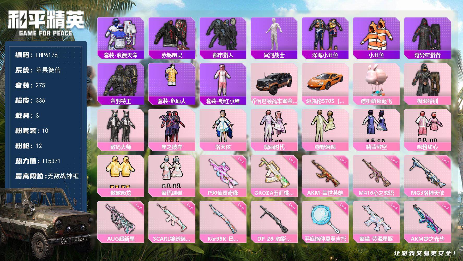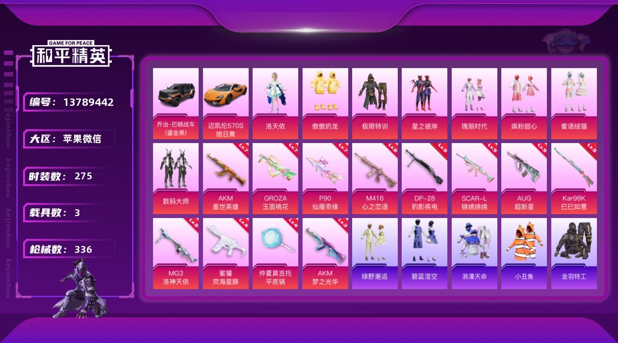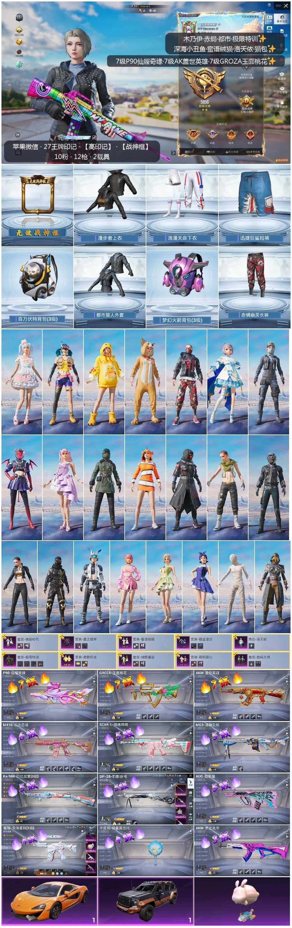 [13789442]素材身法号/老木乃伊/无敌战神框1/绝世印记1/地铁满天赋 苹果 微信-无敌战神框-10粉装-12特效枪-3载具-2粉色飞行器-11.5w热力值-27王牌印记-275套装-336枪皮【热门品类】:套装-浪漫天命,套装-赤蝎幽灵,套装-都市猎人,套装-冥河战士,套装-深海小丑鱼,套装-小丑鱼,套装-奇异狩猎者,套装-金羽特工,套装-龟仙人,套装-粉红小猪【粉色载具】:乔治巴顿战车(鎏金黑),迈凯伦570S(旭日黄),僚机-萌兔起飞【粉色套装】:粉装-极限特训,粉装-数码大师,粉装-星之彼岸,角色-洛天依,粉装-瑰丽时代,粉装-绿野邂逅,粉装-碧蓝澄空,粉装-飒粉甜心,粉装-傲傲奶龙,粉装-蜜语绒猫【粉色枪皮等级】:AKM-梦之光华(三级),AKM-盖世英雄(七级),SCAR-L-锦绣绵绵(五级),M416-心之恋语(六级),GROZA-玉面桃花(七级),AUG-超新星(五级),蜜獾-荧海星豚(四级),P90-仙履奇缘(七级),Kar98K-巳巳如意(五级),DP-28-豹影疾电(五级),MG3-洛神天依(五级),平底锅-仲夏莫吉托(四级)【粉色飞行器】:梦幻火箭飞行器,镜域双华-灵镜之阶