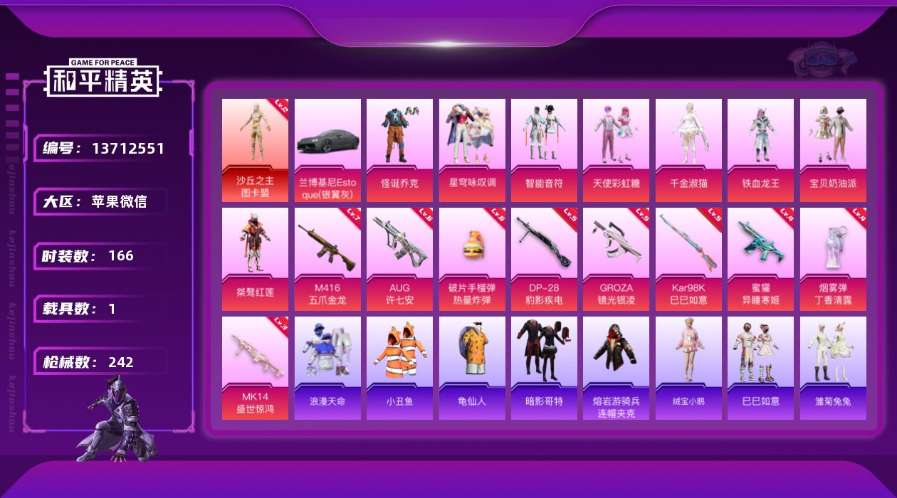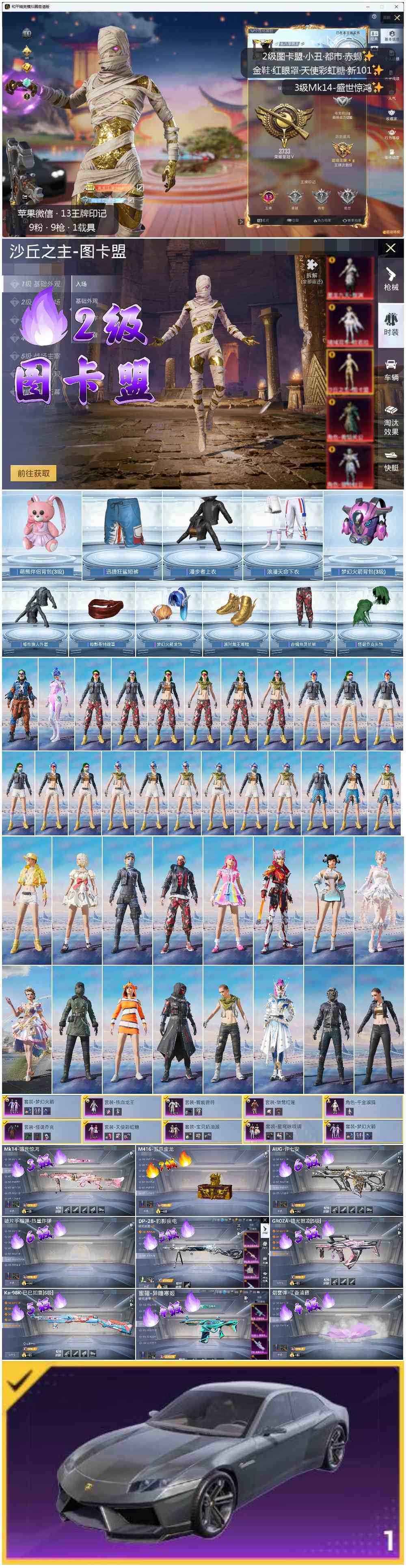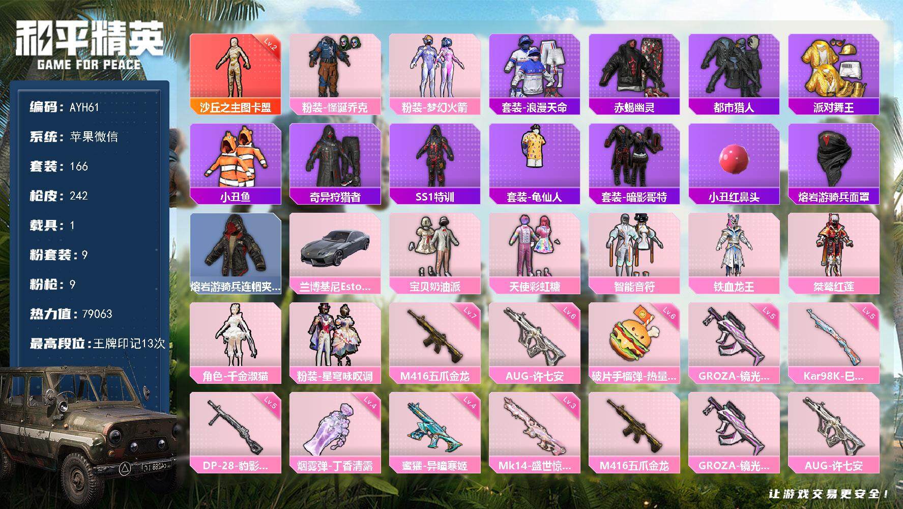 [13712551]可二次【店主推荐捡漏号!可直接换绑】素材号/地铁满天赋 苹果 微信-1神装-9粉装-9特效枪-1载具-3粉色飞行器-79063热力值-13王牌印记-166套装-242枪皮【红色神装等级】:沙丘之主-图卡盟(二级)【红色角色神装】:沙丘之主-图卡盟【热门品类】:粉装-怪诞乔克,粉装-梦幻火箭,套装-浪漫天命,套装-赤蝎幽灵,套装-都市猎人,套装-派对舞王,套装-小丑鱼,套装-奇异狩猎者,套装-SS1特训,套装-龟仙人,套装暗影哥特,小丑红鼻头,熔岩游骑兵面罩,熔岩游骑兵连帽夹克【粉色载具】:兰博基尼Estoque(银翼灰)【粉色套装】:粉装-怪诞乔克,粉装-宝贝奶油派,粉装-天使彩虹糖,粉装-梦幻火箭,粉装-智能音符,粉装-铁血龙王,粉装-桀骜红莲,角色-千金淑猫,粉装-星穹咏叹调【粉色枪皮等级】:M416-五爪金龙(七级),GROZA-镜光银凌(五级),AUG-许七安(六级),蜜獾-异瞳寒姬(四级),Kar98K-巳巳如意(五级),Mk14-盛世惊鸿(三级),DP-28-豹影疾电(五级),烟雾弹-丁香清露(四级),破片手榴弹-热量炸弹(六级)【粉色枪皮】:M416-五爪金龙,GROZA-镜光银凌,AUG-许七安,蜜獾-异瞳寒姬,Kar98K-巳巳如意,Mk14-盛世惊鸿,DP-28-豹影疾电,烟雾弹-丁香清露,破片手榴弹-热量炸弹【粉色飞行器】:酣梦熊熊飞行器,万象金身飞行器