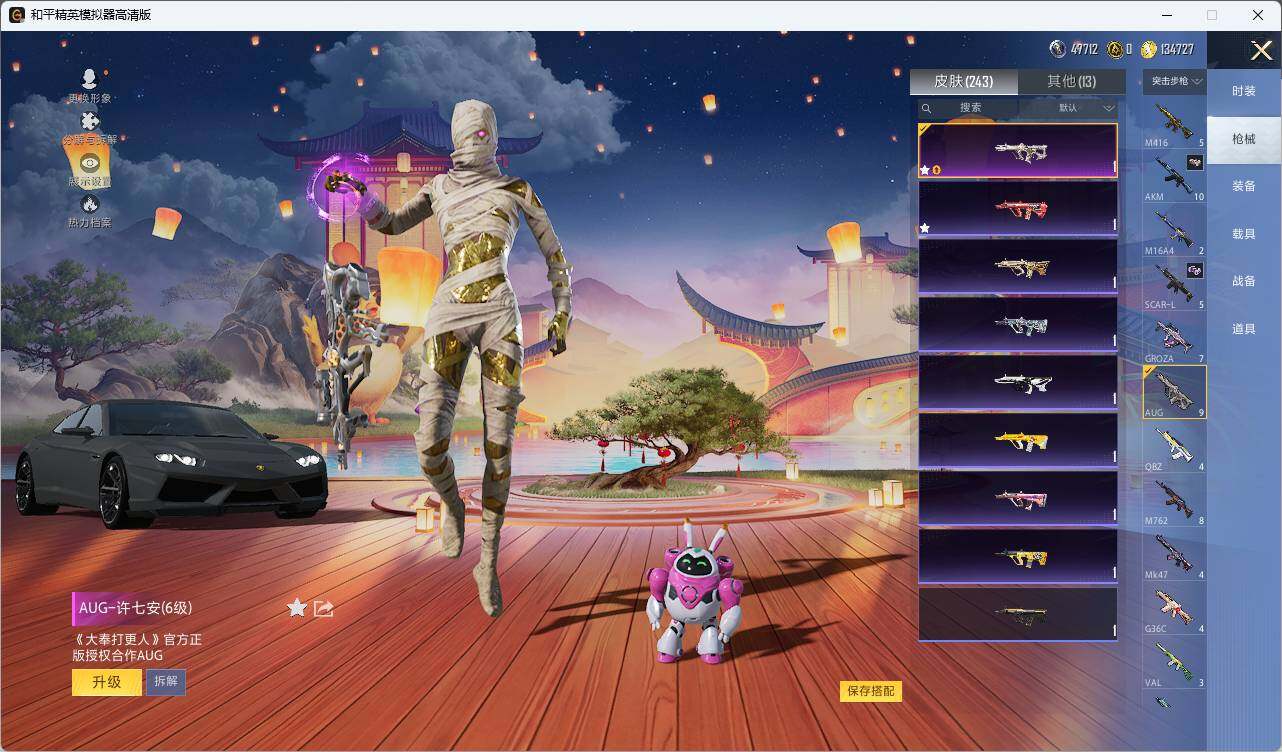 M416-五爪金龙,GROZA-镜光银凌,AUG-许七安,Kar98K-巳巳如意,Mk14-盛世惊鸿,烟雾弹-丁香清露,破片手榴弹-热量炸弹