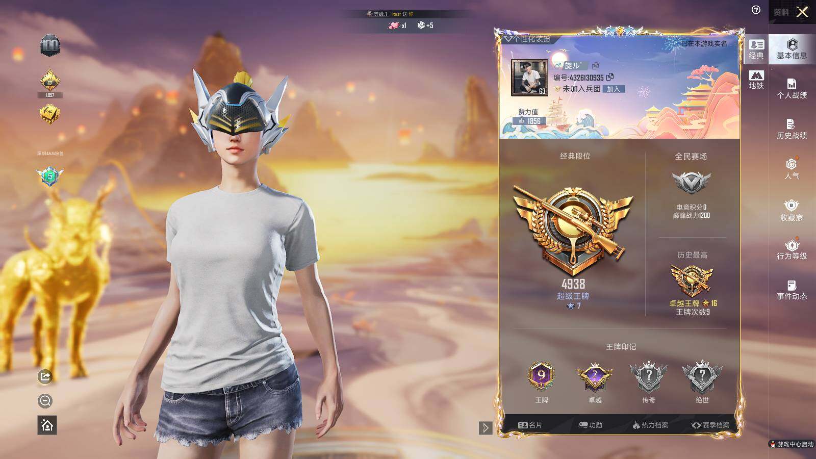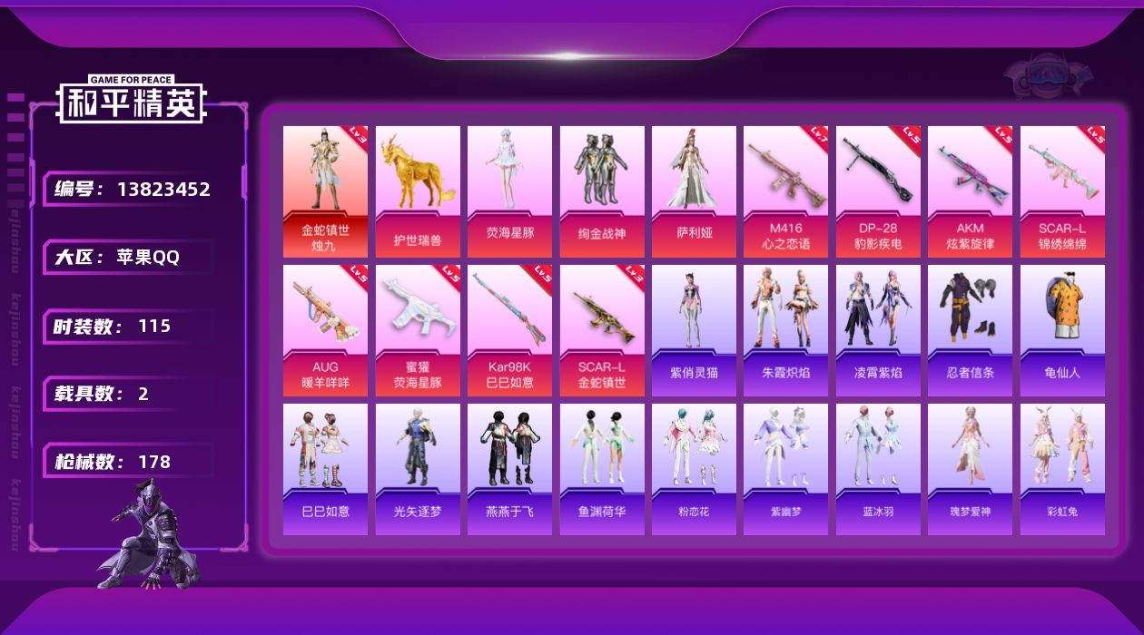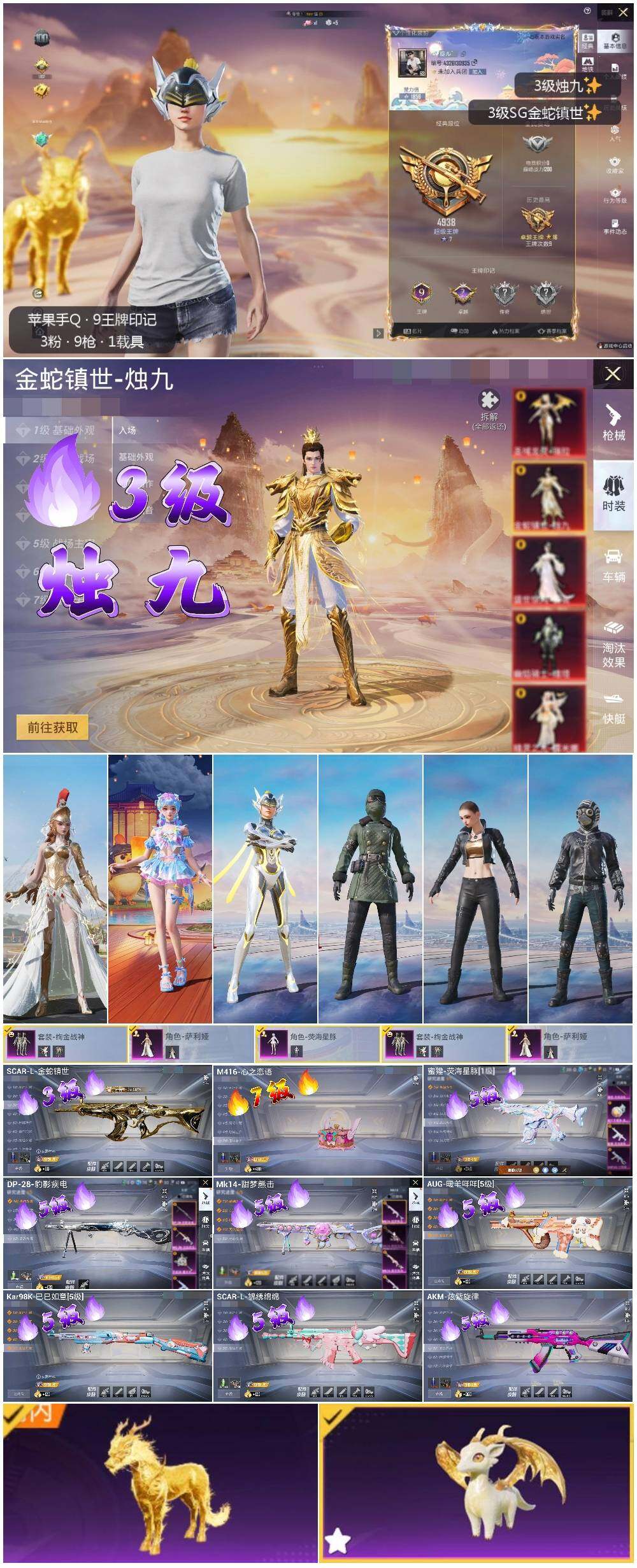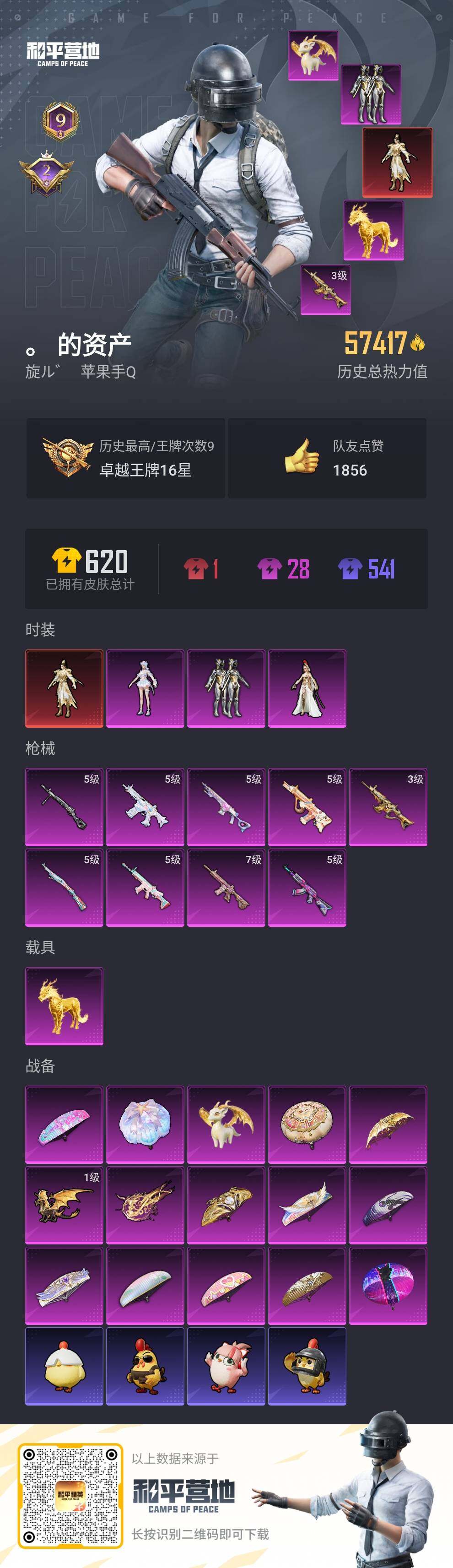 - PX_2077664- 苹果手Q-1王牌印记-4粉装-4特效枪-1载具-23881热力值-69套装-65枪皮-0卓越印记-0传奇印记 【4粉装】,土曜战麒,星云暗核,宙之时溯,万古烈焰 【4特效枪】SCAR-L-万古烈焰-3级 SCAR-L-金蛇镇世-3级 M416-五爪金龙-5级 Kar98K-巳巳如意-1级 【1红装】,金蛇镇世-烛九/1级, 【1稀有紫装】,雪山精英, 【1稀有载具】,护世