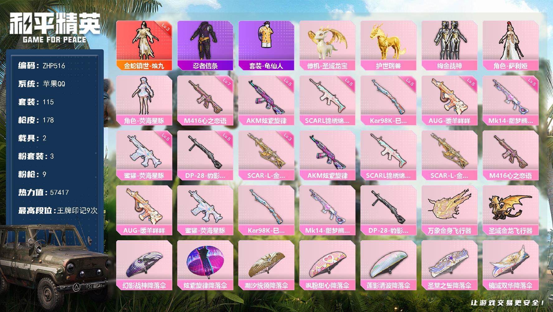 [13823452]可二次【店主推荐捡漏号!可直接换绑】/素材身法号/地铁满天赋 苹果 手Q-1神装-3粉装-9特效枪-2载具-2粉色飞行器-5.7w热力值-9王牌印记-115套装-178枪皮【红色神装等级】:金蛇镇世-烛九(三级)【热门品类】:套装-忍者信条,套装-龟仙人【粉色载具】:僚机-圣域龙宝,护世瑞兽【粉色套装】:粉装-绚金战神,角色-萨利娅,角色-荧海星豚【粉色枪皮等级】:AKM-炫紫旋律(五级),SCAR-L-锦绣绵绵(五级),SCAR-L-金蛇镇世(三级),M416-心之恋语(七级),AUG-暖羊咩咩(五级),蜜獾-荧海星豚(五级),Kar98K-巳巳如意(五级),Mk14-甜梦熊击(五级),DP-28-豹影疾电(五级)【粉色飞行器】:万象金身飞行器,圣域金龙飞行器