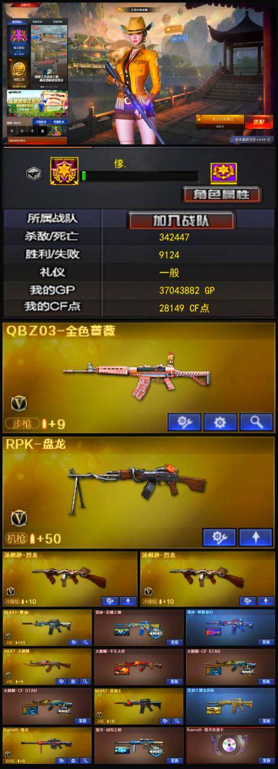【热门武器】:QBZ03-金色蔷薇,王者炎心,M4A1-黑骑士,汤姆逊-烈龙*2,RPK-盘龙,沙鹰-修罗