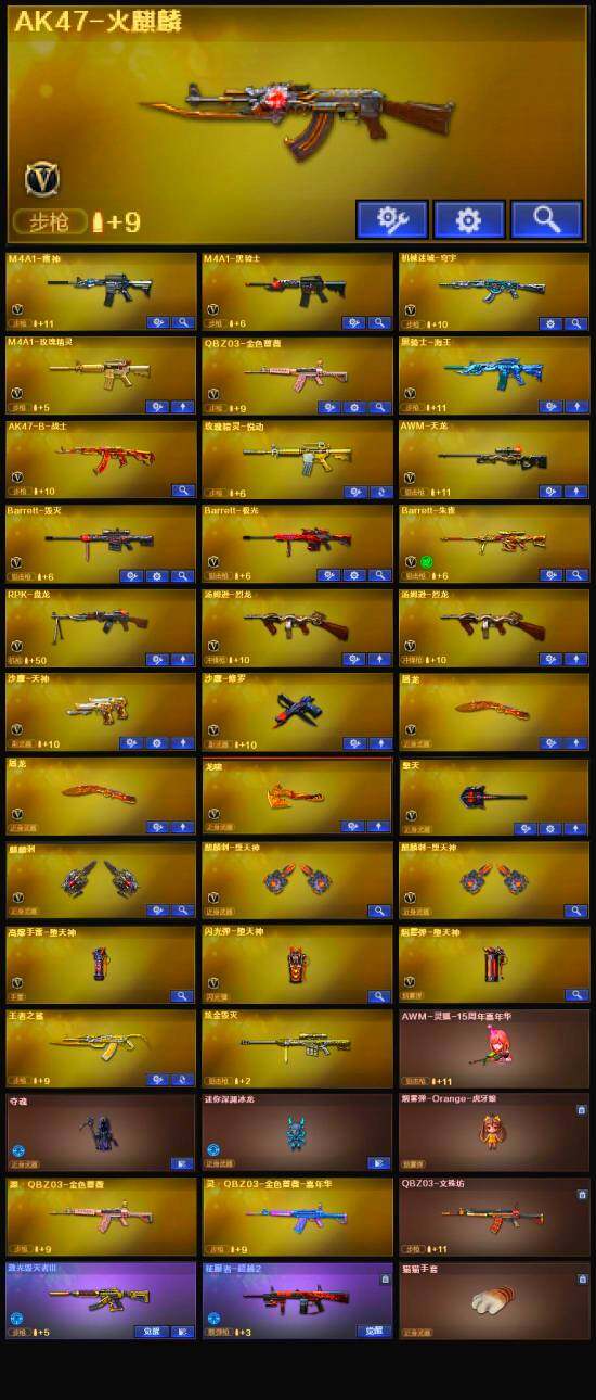【英雄级武器】:AK47-火麒麟,M4A1-雷神,M4A1-黑骑士,M4A1-玫瑰精灵,QBZ03-金色蔷薇,AK-47-猩红传说*4,黑骑士-海王,AWM-天龙,Barrett-毁灭,Barrett-极光,Barrett-朱雀,RPK-盘龙,汤姆逊-烈龙*2,沙鹰-修罗,沙鹰-天神,屠龙*2,龙啸,麒麟刺-堕天神*2,擎天,麒麟刺,高爆手雷-堕天神,闪光弹-堕天神,烟雾弹-堕天神,Barrett-碧霄极光