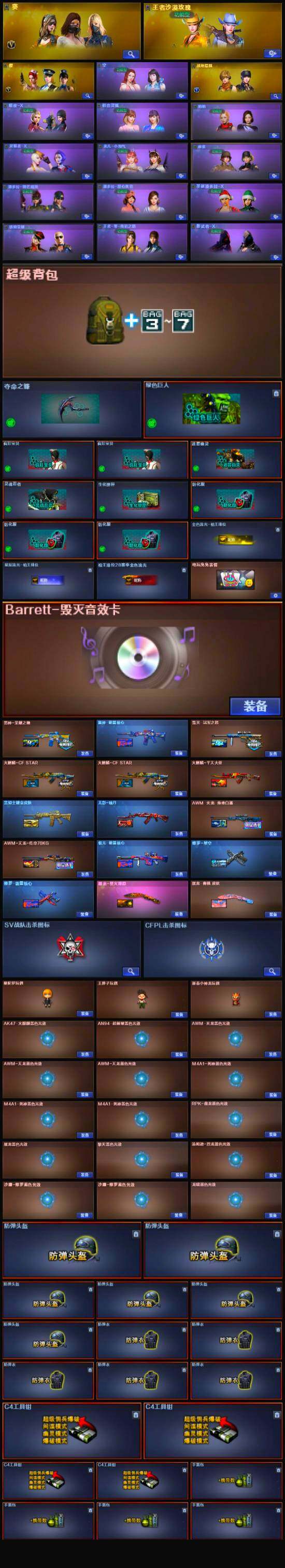 【道具】:云山科技背包,战舰背包,炫彩背包,背包-洛丽塔,超级背包,女皇终结者-魔龙之吻,救世主-黑桃战神,绿色巨人,灵魂忍者,迷雾幽灵,生化弹匣,夺命之镰,防化服*3,金色流光-枪王排位,星辰流光-枪王排位,流光-鎏金之域,枪王排位28赛季金色流光,枪王排位29赛季金色流光,萌萌小葵表情,电玩兔兔表情,防弹头盔*6,防弹衣*5,C4工具钳*4,手雷包*4