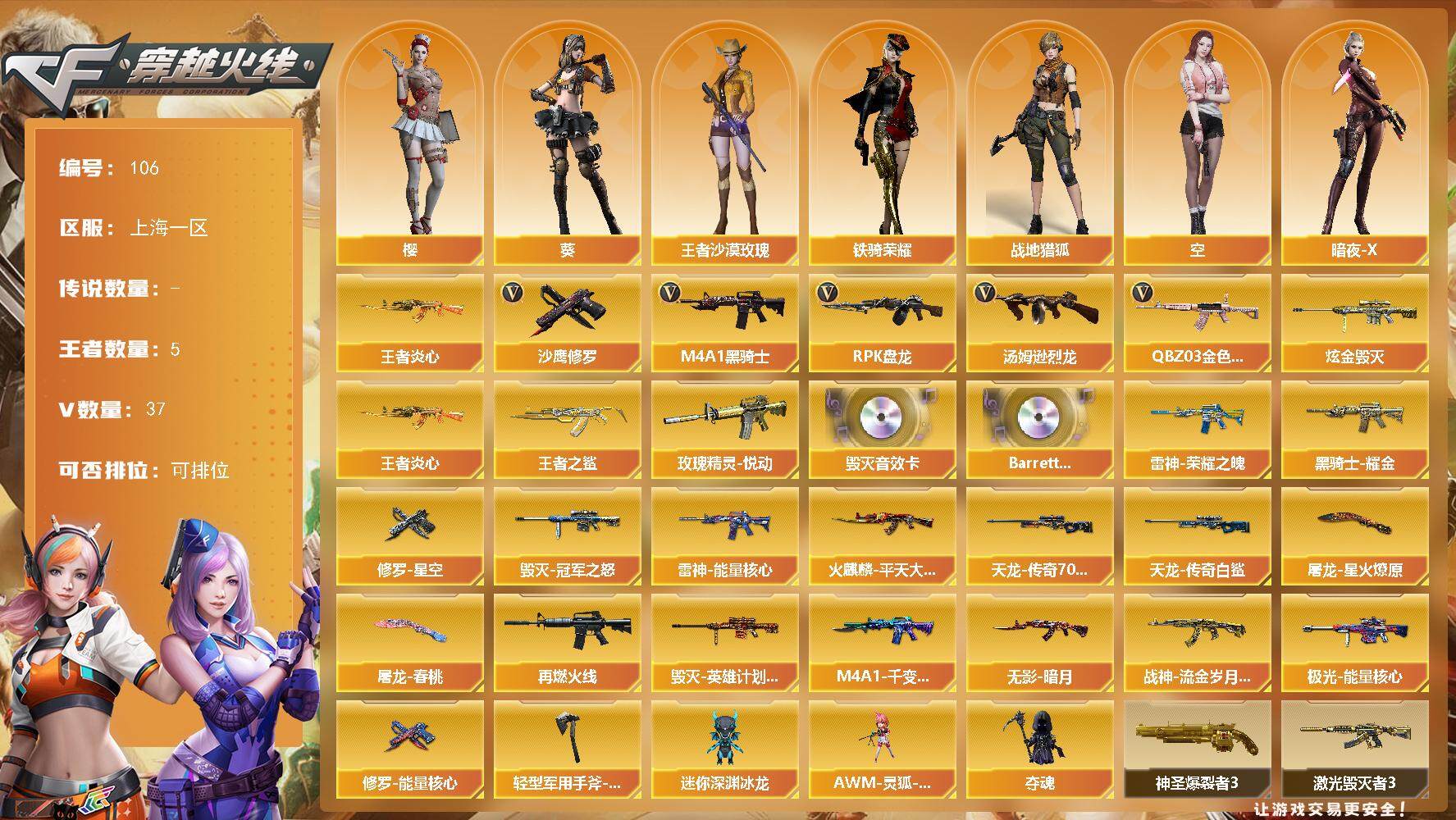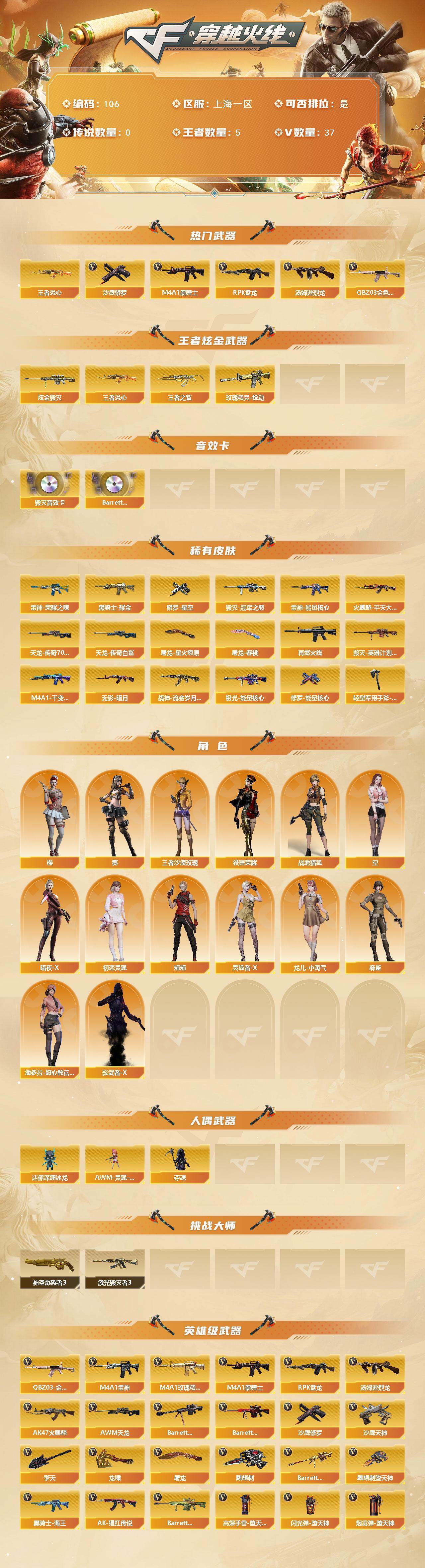 [13775911]上海一区-37V-5王者-1炫金 【热门武器】:QBZ03-金色蔷薇,王者炎心,M4A1-黑骑士,汤姆逊-烈龙*2,RPK-盘龙,沙鹰-修罗 【王者炫金武器】:王者炎心,王者之鲨,玫瑰精灵-悦动,炫金毁灭 【音效卡】:Barrett-毁灭音效卡,Barrett-碧霄极光音效卡 【皮肤】:雷神-能量核心,雷神-荣耀之魄,M4A1-再燃火线,火麒麟-平天大圣,毁灭-冠军之怒,毁灭-英雄计划 皮肤,M4A1-千变-孔明皮肤,黑骑士耀金皮肤,无影-暗月,战神-流金岁月皮肤*3,AWM-天龙-传奇70KG,AWM-天龙-传奇白鲨,极光-能量核心,修罗-能量核心,修罗-星空,屠龙-星火燎原,屠龙-春桃 皮肤,轻型军用手斧-再燃火线 【角色】:葵,樱,战地猎狐,王者沙漠玫瑰,空,暗夜-X,初恋灵狐,娟娟,灵狐者-X,龙儿-小淘气,麻雀,潘多拉-甜心教官,铁骑荣耀,影武者-X 【人偶武器】:AWM-灵狐-15周年嘉年华,迷你深渊冰龙,夺魂 【挑战大师】:神圣爆裂者III,激光毁灭者III 【英雄级武器】:AK47-火麒麟,M4A1-雷神,M4A1-黑骑士,M4A1-玫瑰精灵,QBZ03-金色蔷薇,AK-47-猩红传说*4,黑骑士-海王,AWM-天龙,Barrett-毁灭,Barrett-极光,Barrett-朱雀,RPK-盘龙,汤姆逊-烈龙*2,沙鹰-修罗,沙鹰-天神,屠龙*2,龙啸,麒麟刺-堕天神*2,擎天,麒麟刺,高爆手雷-堕天神,闪光弹-堕天神,烟雾弹-堕天神,Barrett-碧霄极光 【道具】:云山科技背包,战舰背包,炫彩背包,背包-洛丽塔,超级背包,女皇终结者-魔龙之吻,救世主-黑桃战神,绿色巨人,灵魂忍者,迷雾幽灵,生化弹匣,夺命之镰,防化服*3,金色流光-枪王排位,星辰流光-枪王排位,流光-鎏金之域,枪王排位28赛季金色流光,枪王排位29赛季金色流光,萌萌小葵表情,电玩兔兔表情,防弹头盔*6,防弹衣*5,C4工具钳*4,手雷包*4 【特殊枪械】:1黑骑士,2烈龙,1盘龙