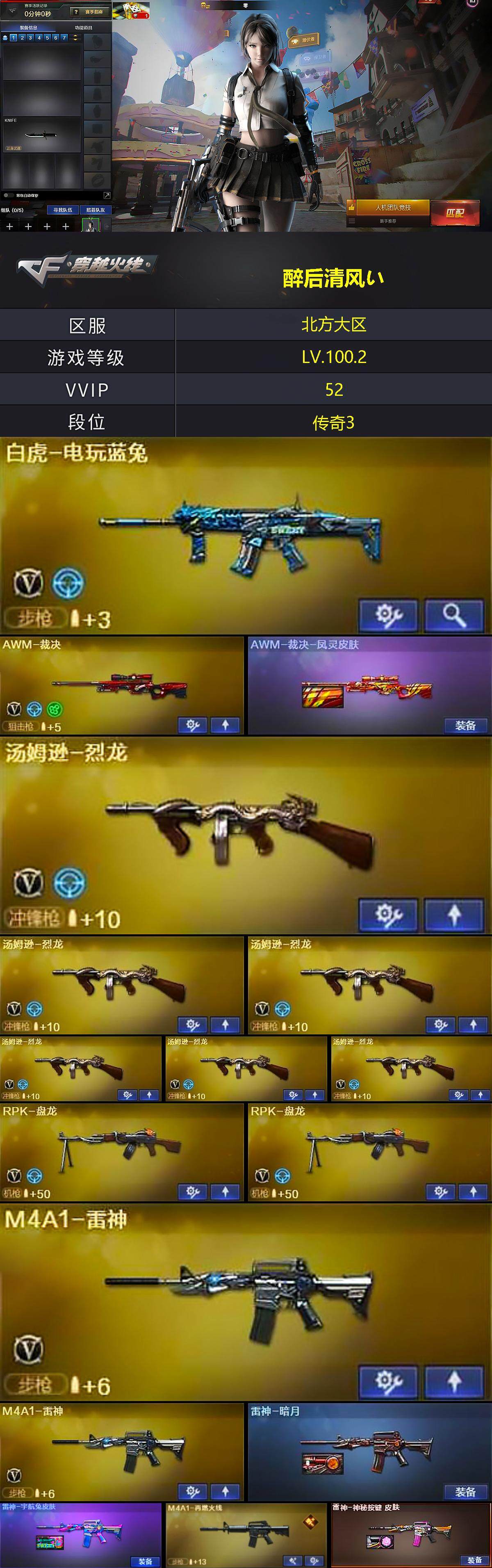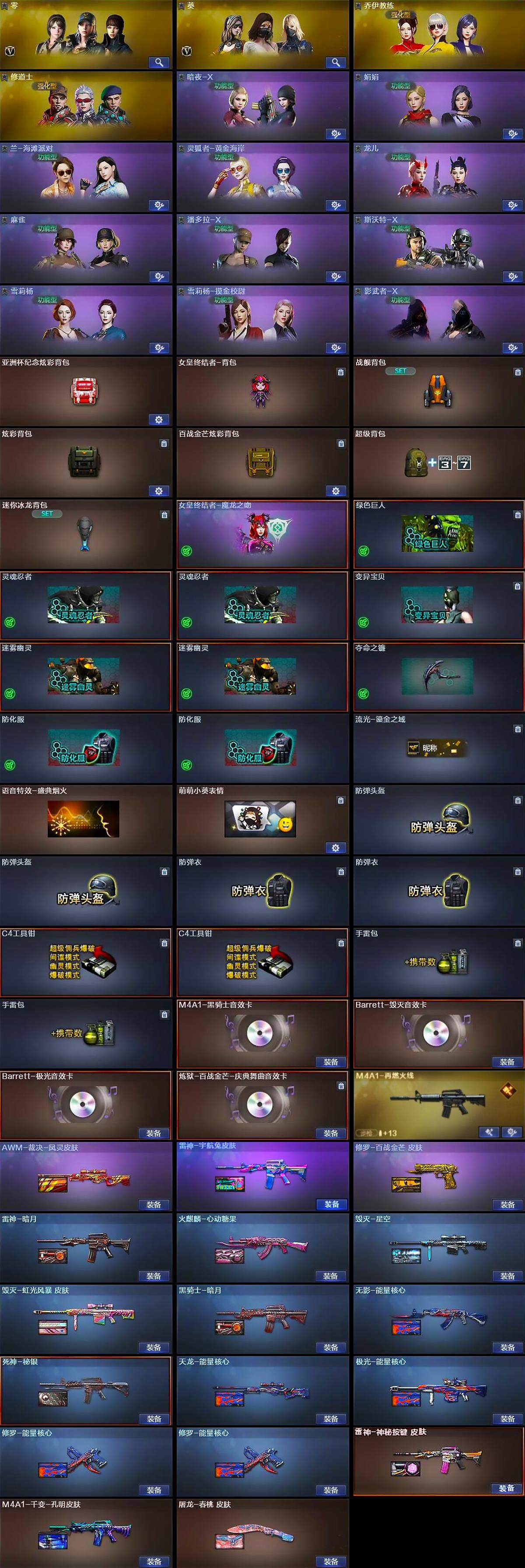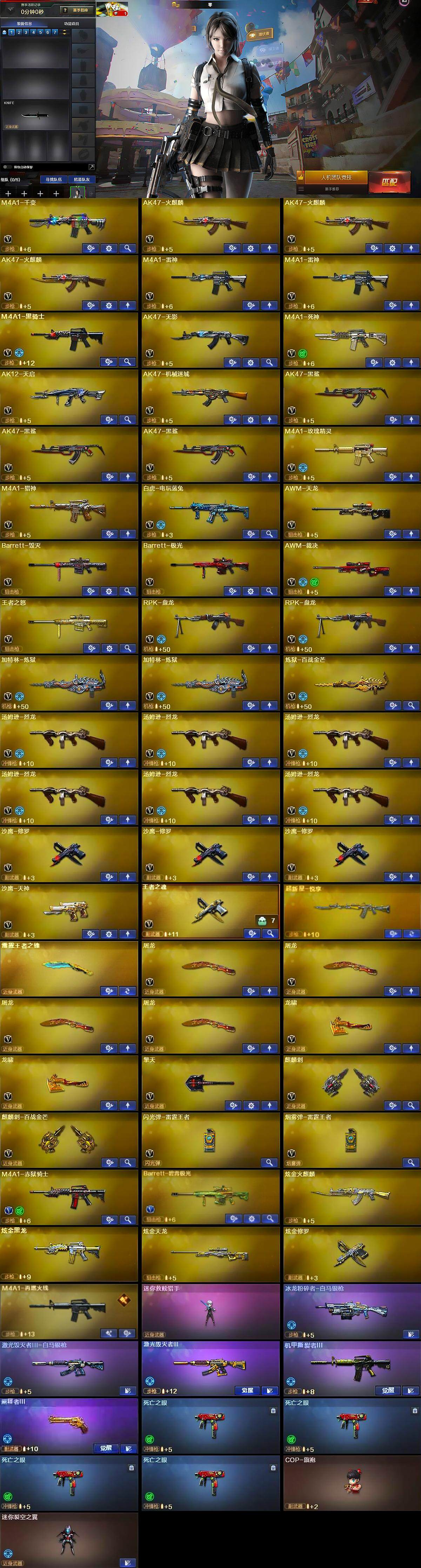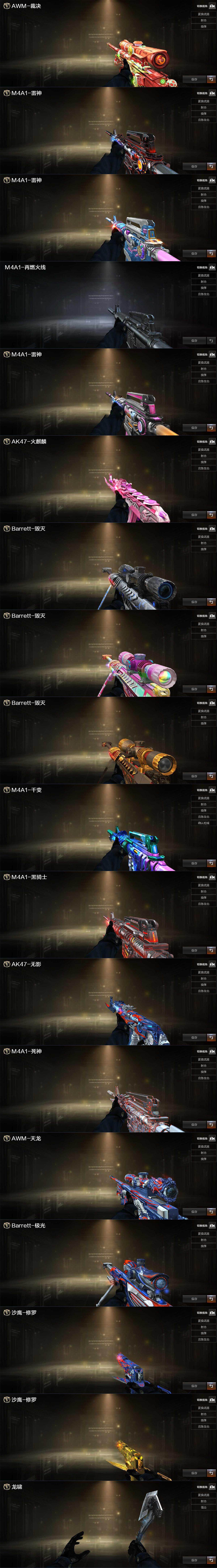 【英雄级武器】:M4A1-千变,AK47-火麒麟*3,M4A1-雷神*2,M4A1-黑骑士,AK47-无影,M4A1-死神,AK12-天启,AK47-机械迷城,AK47-黑鲨*3,M4A1-玫瑰精灵,M4A1-猎神,白虎-电玩蓝兔,AWM-天龙,Barrett-毁灭,Barrett-极光,AWM-裁决,Barrett-金色蔷薇,王者之怒-觉醒版,RPK-盘龙*2,加特林-炼狱*2,炼狱-百战金芒,汤姆逊-烈龙*6,沙鹰-修罗*3,沙鹰-天神,王者之魂-觉醒版,屠龙*4,龙啸*2,擎天,麒麟刺,麒麟刺-百战金芒,闪光弹-雷霆王者-觉醒版,烟雾弹-雷霆王者-觉醒版,M4A1-赤狱骑士,Barrett-碧霄极光