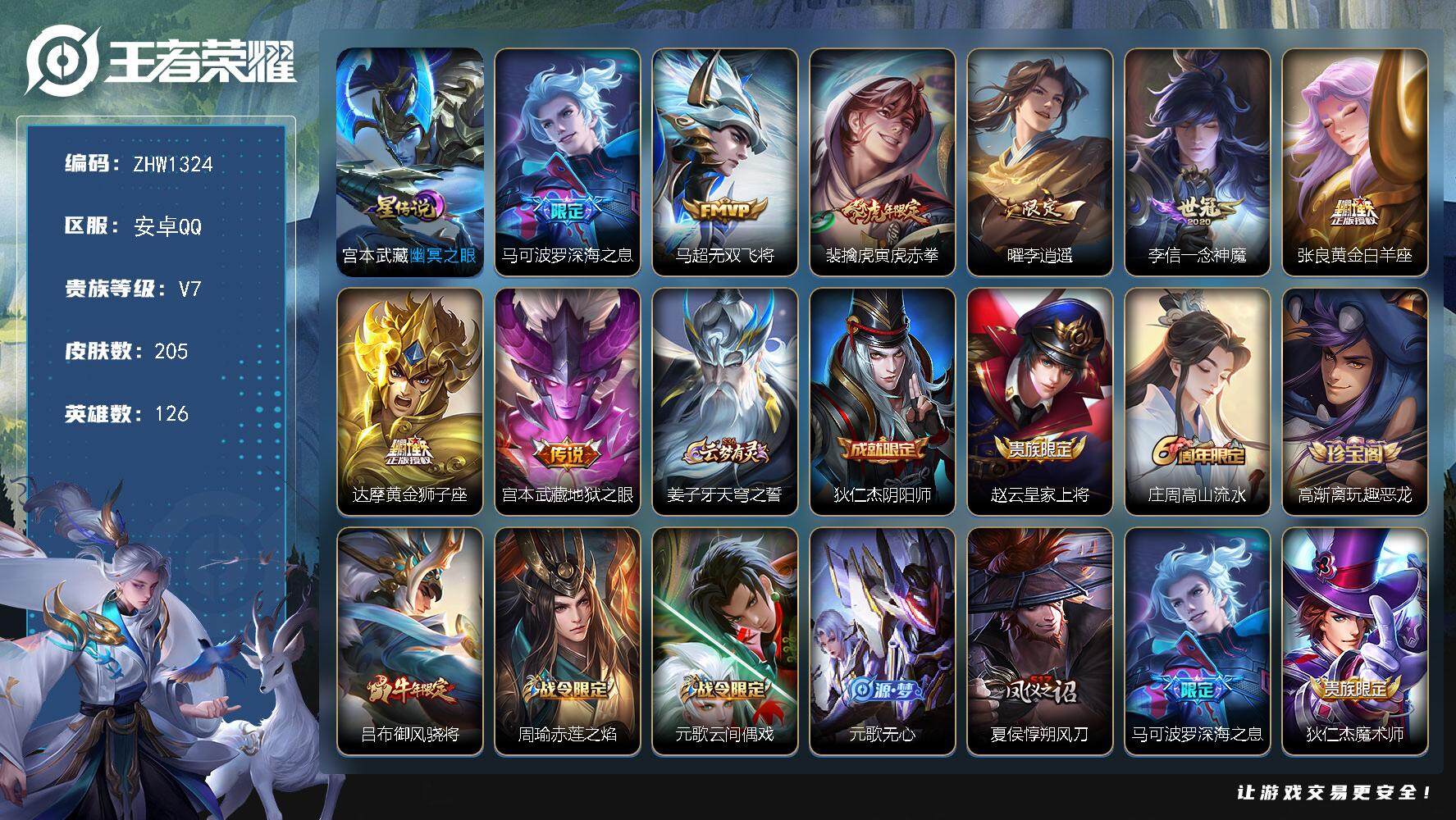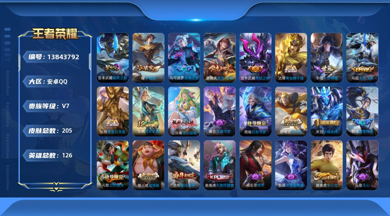 [13843792]不可二次【店主推荐捡漏号!可直接换绑】安卓Q-V7-最强王者段位-126英雄-205皮肤-0典藏-0珍品无双-0无双-0珍品传说-8传说-55史诗