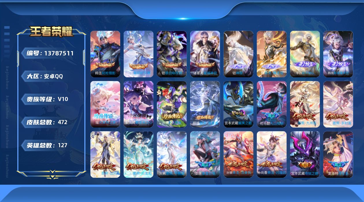 [13787511]可二次【店主推荐捡漏号!可直接换绑】安卓Q-V10-至尊星耀II段位-127英雄-472皮肤-4典藏-4无双-4珍品传说-41传说-150史诗