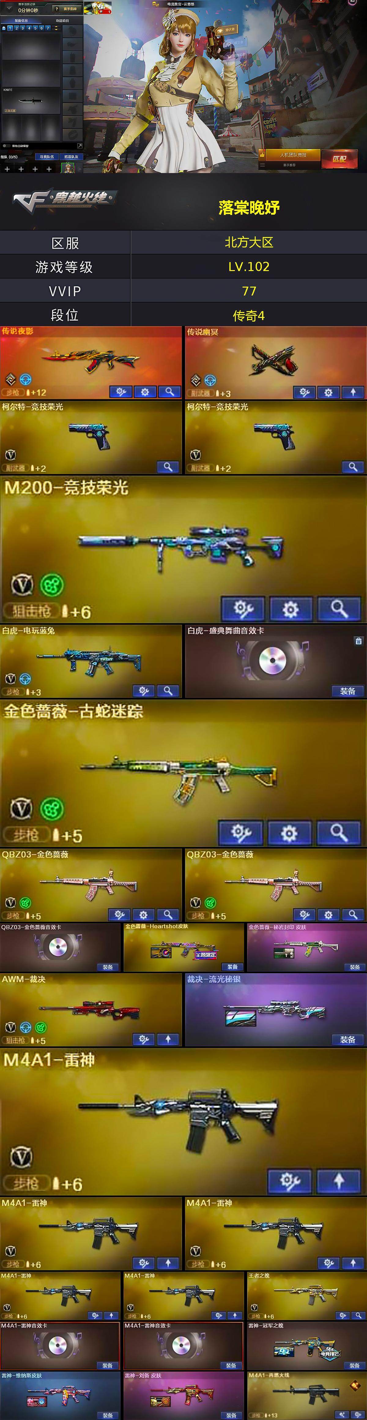 【热门武器】:传说夜影,传说幽冥,QBZ03-金色蔷薇*2,金色蔷薇-古蛇迷踪,修罗-古蛇迷踪,M200-竞技荣光,白虎-电玩蓝兔,金色小号,C.A.T,M4A1-黑骑士,加特林-炼狱
