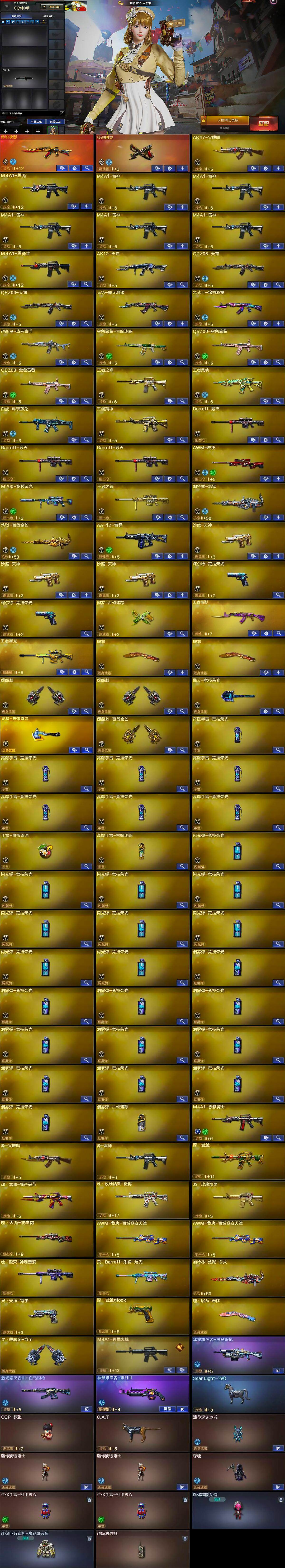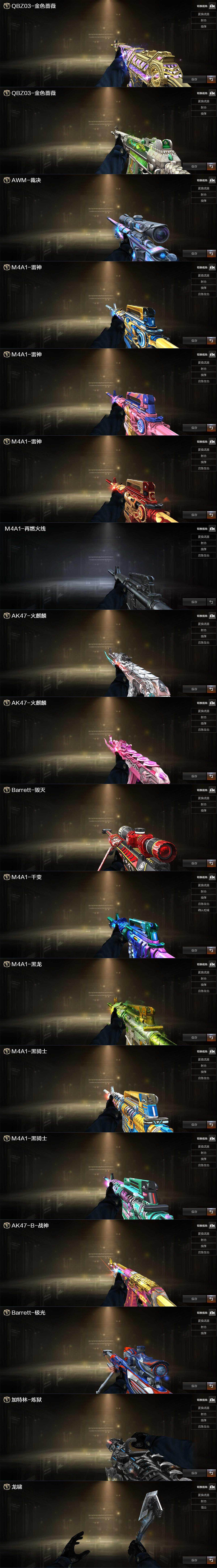 【英雄级武器】:AK47-火麒麟,M4A1-黑龙,M4A1-雷神*5,M4A1-黑骑士,AK12-天启,QBZ03-天罚*2,无影-神兵利器,黑武士-锦绣游龙,超新星-热带奇洋,金色蔷薇-古蛇迷踪,QBZ03-金色蔷薇*2,王者之魄-觉醒版,王者风势-觉醒版,白虎-电玩蓝兔,王者猎神-觉醒版,Barrett-毁灭*3,AWM-裁决,M