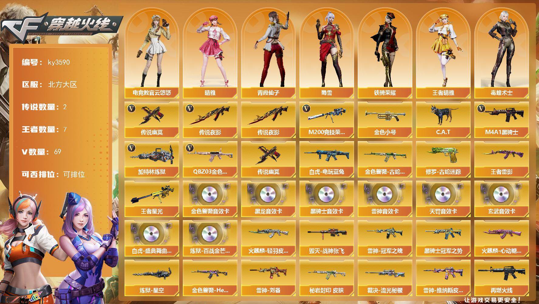 [13851932]北方大区-69V-7王者-0炫金 【传说武器】:传说夜影,传说幽冥 【热门武器】:传说夜影,传说幽冥,QBZ03-金色蔷薇*2,金色蔷薇-古蛇迷踪,修罗-古蛇迷踪,M200-竞技荣光,白虎-电玩蓝兔,金色小号,C.A.T,M4A1-黑骑士,加特林-炼狱 【王者炫金武器】:王者雷影,王者星光 【音效卡】:M4A1-雷神音效卡*2,M4A1-黑龙音效卡,M4A1-黑骑士音效卡,QBZ03-金色蔷薇音效卡,QBZ03-天罚音效卡*2,M14EBR-玄武音效卡,白虎-盛典舞曲音效卡,炼狱-百战金芒-庆典舞曲音效卡 【皮肤】:金色蔷薇-Heartshot皮肤,金色蔷薇-秘岩封印 皮肤,裁决-流光秘银,雷神-冠军之魄,雷神-维纳斯皮肤,雷神-刘备 皮肤,M4A1-再燃火线,火麒麟-轻羽皮肤,火麒麟-心动糖果,毁灭-战神张飞,M4A1-千变-孔明皮肤,黑龙-美杜莎 皮肤,黑骑士-冠军之势,黑骑士-电玩青兔皮肤,战神-粉色甜心皮肤,AK47-B-常胜将军-刘备,极光-能量核心,炼狱-星空,轻型军用手斧-再燃火线 【角色】:电竞教官-云悠悠,晴雅,毒蝰术士,王者晴雅,蛇隐宗,奇洋探员,乔伊教练,暗夜-X,北极狐-X,初恋灵狐,电竞少女,芳心审判者,飞虎队-X,风暴女,虎妞,嘉年华灵狐,葵-赛博朋克,0号玩家,灵狐-花神,灵狐者-X,灵狐者-黄金海岸,麻雀,曼陀罗-X,曼陀罗-礼服,玫瑰花神,萌儿,娜塔莉娅,潘多拉-X,潘多拉-甜心教官,潜龙队-X,青霞仙子,蛇姬,斯沃特-X,蜀雪,铁骑荣耀,兔囡囡,维纳斯,新娜塔莎,夜玫瑰-宠粉,影武者-X,游珑儿,智影 【人偶武器】:Scar Light-马枪,COP-旗袍,C.A.T,迷你深渊冰龙,迷你波特博士*2,夺魂,生化手雷-机甲核心*2,迷你超能女侍,迷你巨石泰坦-魔花研究所,灵狐娃娃手雷*2 【暴走生化】:超级对讲机 【挑战大师】:冰龙粉碎者-白马银枪,激光毁灭者III-白马银枪,神圣爆裂者-末日III 【英雄级武器】:AK47-火麒麟,M4A1-黑龙,M4A1-雷神*5,M4A1-黑骑士,AK12-天启,QBZ03-天罚*2,无影-神兵利器,黑武士-锦绣游龙,超新星-热带奇洋,金色蔷薇-古蛇迷踪,QBZ03-金色蔷薇*2,王者之魄-觉醒版,王者风势-觉醒版,白虎-电玩蓝兔,王者猎神-觉醒版,Barrett-毁灭*3,AWM-裁决,M