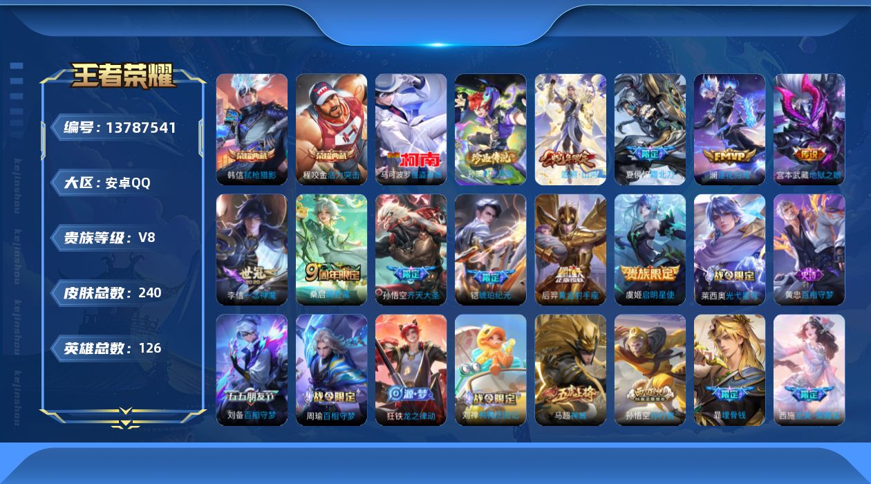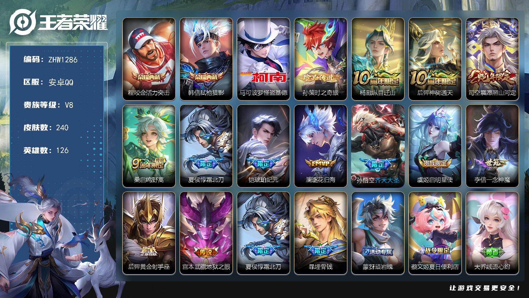 [13787541]可二次【店主推荐捡漏号!可直接换绑安卓Q-V8-最强王者段位-126英雄-240皮肤-2典藏-2珍品传说-12传说-68史诗
