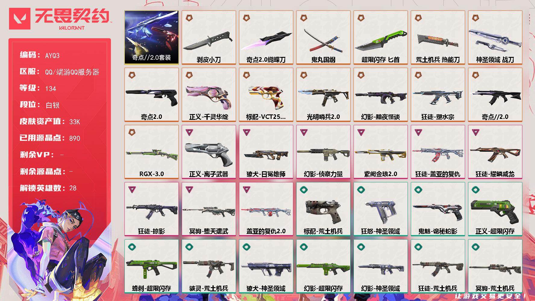 [13788331]可秒换绑!库存资产33970【套装】:奇点//2.0套装 【英雄】:幻棱,炼狱,维斯,暮蝶,钛狐,壹决,铁臂,捷风,雷兹,幽影,不死鸟,贤者,猎枭,蝰蛇,零,芮娜,奇乐,尚勃勒,霓虹,斯凯,夜露,星礈,K/O,海神,盖可,黑梦,钢锁 【近战 武器】:近战武器-剥皮小刀,近战武器-奇点//2.0 蝴蝶刀,近战武器-鬼丸国纲,近战武器-超限闪存 匕首,近战武器-荒土机兵 热能刀,近战武器-神圣领域 战刀 【狂徒】:狂徒-奇点//2.0,狂徒-塑水宗,狂徒-掠影,狂徒-盖亚的复仇,狂徒-耀鳞威龙,狂徒-荒土机兵 【幻影】:幻影-黯夜怪谈,幻影-侦察力量,幻影-紫阙金琅//2.0,幻影-超限闪存,幻影-神圣领域,幻影-纳米打击 【戍卫】:戍卫-浮光跃金,戍卫-逆冲蛮牛,戍卫-月球哨兵 【獠犬】:獠犬-日冕雄师,獠犬-神圣领域,獠犬-模拟赫兹,獠犬-逆冲蛮牛 【冥驹】:冥驹-堕天遗武,冥驹-荒土机兵,冥驹-模拟赫兹,冥驹-星云暗涌 【莽侠】:莽侠-RGX 11z Pro//3.0,莽侠-超限闪存,莽侠-月球哨兵 【战神】:战神-盖亚的复仇//2.0,战神-神圣领域,战神-浮光跃金 【奥丁】:奥丁-纳米打击 【判官】:判官-纳米打击x 【雄鹿】:雄鹿-模拟赫兹,雄鹿-逆冲蛮牛,雄鹿-月球哨兵 【骇灵】:骇灵-光明哨兵//2.0,骇灵-荒土机兵,骇灵-浮光跃金,骇灵-星云暗涌 【蜂刺】:蜂刺-超限闪存,蜂刺-星云暗涌 【标配】:标配-荒土机兵,标配-浮光跃金 【VCT手枪】:标配-VCT25 x EDG 【正义】:正义-千灵华绽,正义-离子武器,正义-超限闪存,正义-纳米打击,正义-月球哨兵 【鬼魅】:鬼魅-奇点//2.0,鬼魅-诡秘蛇影,鬼魅-模拟赫兹,鬼魅-星云暗涌 【狂怒】:狂怒-神圣领域,狂怒-逆冲蛮牛 【卡面】:终章:激斗汉堡 卡面,进入射程 卡面,分崩离析 卡面,纳米打击 卡面,抑制技术 卡面,激斗汉堡 卡面,瓦娃脸雪糕 P2 卡面,从黄昏到黎明 卡面,荒土机兵 卡面,银弹猎手 卡面,逆冲蛮牛 卡面,《双城之战》拥抱 卡面,精灵大战 卡面,欢迎来到底城 卡面,南瓜盛典 卡面,VCT CN首冠 卡面,唱片的故事 卡面,钢弓与箭弦 卡面,排除故障 卡面,奇点//2.0 卡面,战术桌游 卡面,悠享食光 卡面,修车达人 卡面,模拟赫兹 卡面,浮光跃金 卡面,超限闪存 卡面,