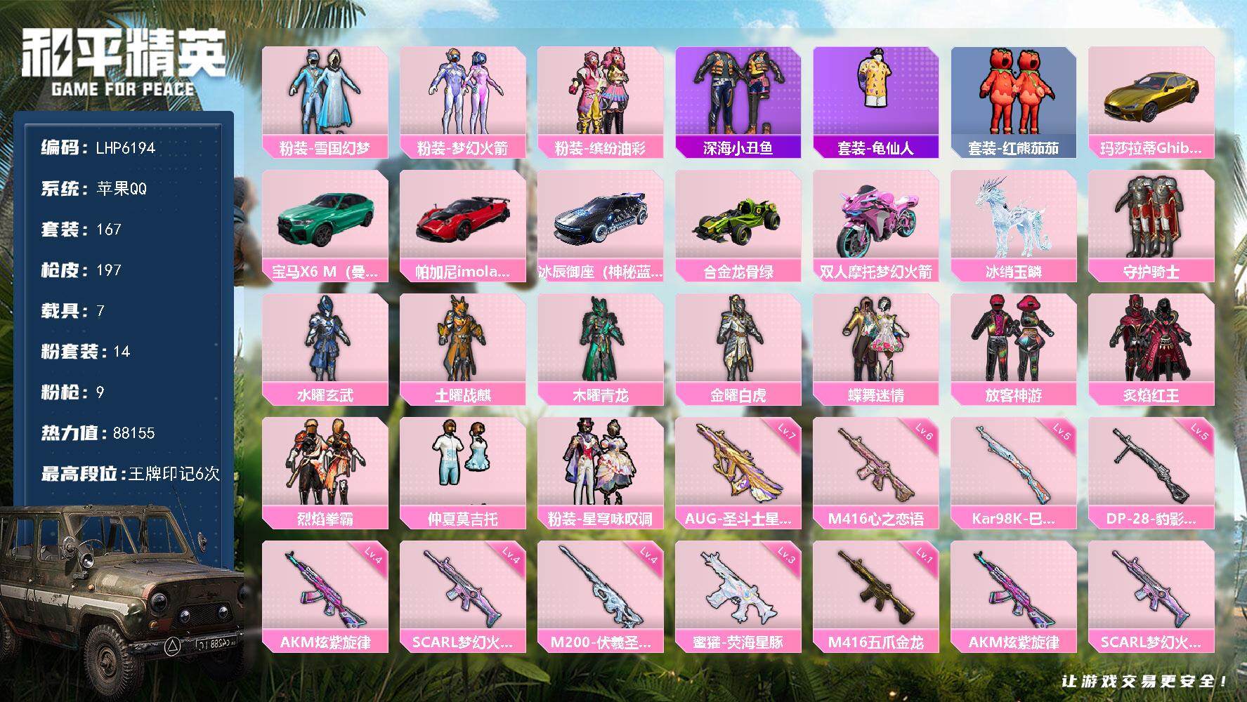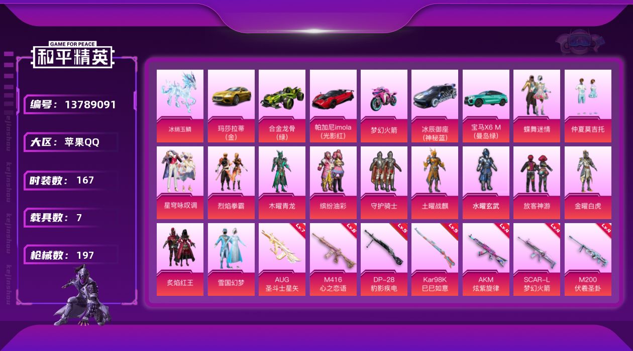 [13789091]【店主推荐捡漏号!可直接换绑】/素材身法号/绝世印记1 苹果 手Q-14粉装-9特效枪-7载具-5粉色飞行器-8.8w热力值-6王牌印记-167套装-197枪皮【热门品类】:粉装-雪国幻梦,粉装-梦幻火箭,粉装-缤纷油彩,套装-深海小丑鱼,套装-龟仙人,套装-红熊茄茄【粉色载具】:玛莎拉蒂Ghibli(金),宝马X6 M(曼岛绿),帕加尼imola(光影红),冰辰御座(神秘蓝),合金龙骨(绿),双人摩托-梦幻火箭,冰绡玉鳞【粉色套装】:粉装-守护骑士,粉装-水曜玄武,粉装-土曜战麒,粉装-木曜青龙,粉装-金曜白虎,粉装-雪国幻梦,粉装-蝶舞迷情,粉装-梦幻火箭,粉装-缤纷油彩,粉装-放客神游,粉装-炙焰红王,粉装-烈焰拳霸,粉装-仲夏莫吉托,粉装-星穹咏叹调【粉色枪皮等级】:AKM-炫紫旋律(四级),SCAR-L-梦幻火箭(四级),M416-五爪金龙(一级),M416-心之恋语(六级),AUG-圣斗士星矢(七级),蜜獾-荧海星豚(三级),Kar98K-巳巳如意(五级),M200-伏羲圣卦(四级),DP-28-豹影疾电(五级)【粉色飞行器】:梦幻火箭飞行器,圣域金龙飞行器,灵珠游龙飞行器