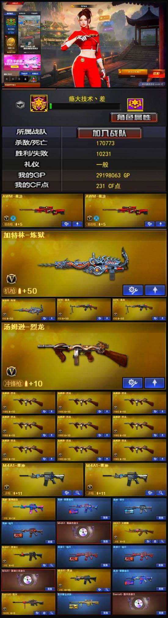 【热门武器】:M4A1-黑骑士,汤姆逊-烈龙*10,RPK-盘龙*2,加特林-炼狱*2,沙鹰-修罗
