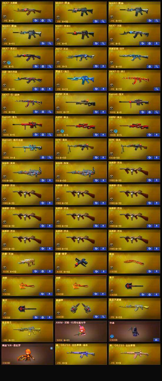 【英雄级武器】:AK47-火麒麟,M4A1-黑龙,M4A1-雷神*2,M4A1-黑骑士,AK47-无影,AK47-黑武士,AK12-天启,无影-神兵利器,AK-47-猩红传说,AK47-B-战神,黑骑士-海王,AWM-天龙,Barrett-毁灭,Barrett-极光,AWM-裁决*2,RPK-盘龙*2,加特林-炼狱*2,汤姆逊-烈龙*10,沙鹰-修罗,沙鹰-天神,屠龙,龙啸*2,擎天*2,麒麟刺