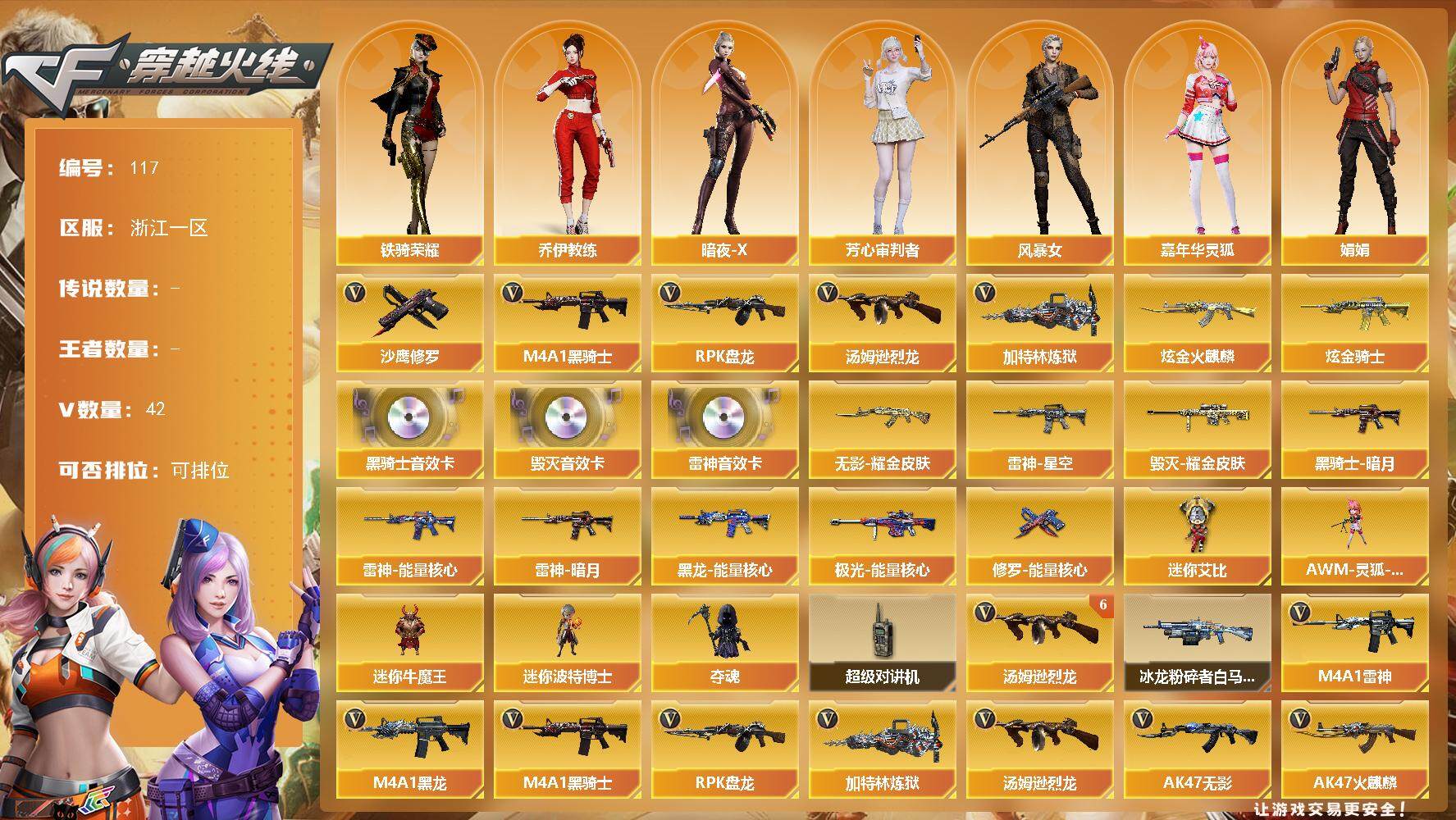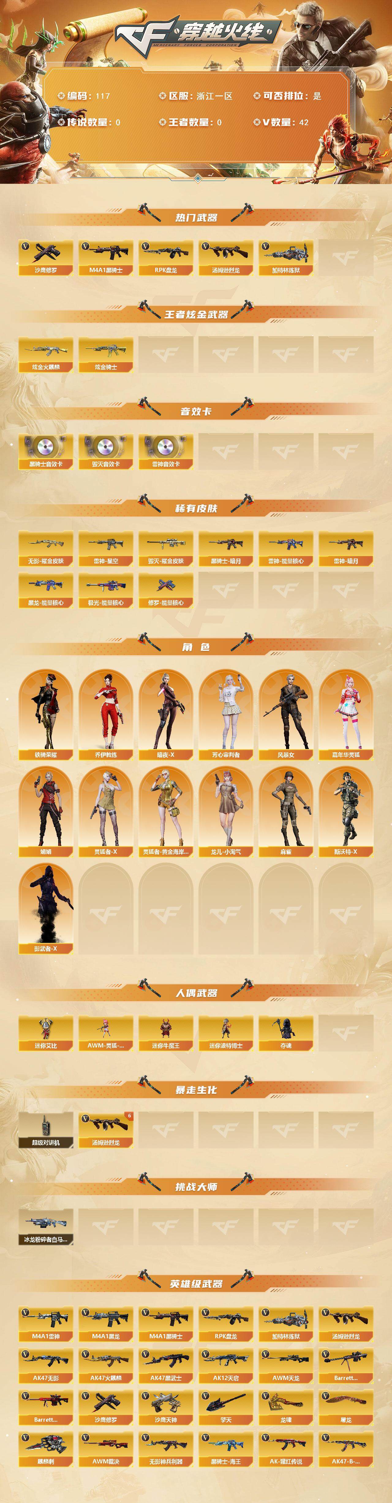 [13809121]浙江一区-42V-0王者-2炫金 【热门武器】:M4A1-黑骑士,汤姆逊-烈龙*10,RPK-盘龙*2,加特林-炼狱*2,沙鹰-修罗 【王者炫金武器】:炫金火麒麟,炫金骑士 【音效卡】:M4A1-雷神音效卡,M4A1-黑骑士音效卡,Barrett-毁灭音效卡 【皮肤】:雷神-暗月,雷神-能量核心,雷神-星空,毁灭耀金皮肤,黑龙-能量核心,黑骑士-暗月*2,无影耀金皮肤,极光-能量核心,修罗-能量核心 【角色】:乔伊教练,暗夜-X,芳心审判者,风暴女,嘉年华灵狐,娟娟,灵狐者-X,灵狐者-黄金海岸,龙儿-小淘气,麻雀,斯沃特-X,铁骑荣耀,影武者-X 【人偶武器】:AWM-灵狐-15周年嘉年华,迷你牛魔王,迷你波特博士,夺魂,迷你艾比 【暴走生化】:超级对讲机 【挑战大师】:冰龙粉碎者-白马银枪 【英雄级武器】:AK47-火麒麟,M4A1-黑龙,M4A1-雷神*2,M4A1-黑骑士,AK47-无影,AK47-黑武士,AK12-天启,无影-神兵利器,AK-47-猩红传说,AK47-B-战神,黑骑士-海王,AWM-天龙,Barrett-毁灭,Barrett-极光,AWM-裁决*2,RPK-盘龙*2,加特林-炼狱*2,汤姆逊-烈龙*10,沙鹰-修罗,沙鹰-天神,屠龙,龙啸*2,擎天*2,麒麟刺 【道具】:冰冰企鹅背包,超级背包,绿色巨人,灵魂忍者*2,变异宝贝,迷雾幽灵,生化弹匣,夺命之镰*2,防化服*3,金色流光-枪王排位*2,枪王排位28赛季金色流光,C4-红龙,防弹头盔*5,防弹衣*4,C4工具钳*3,手雷包*5 【特殊枪械】:1黑骑士,6烈龙,2盘龙,2炼狱