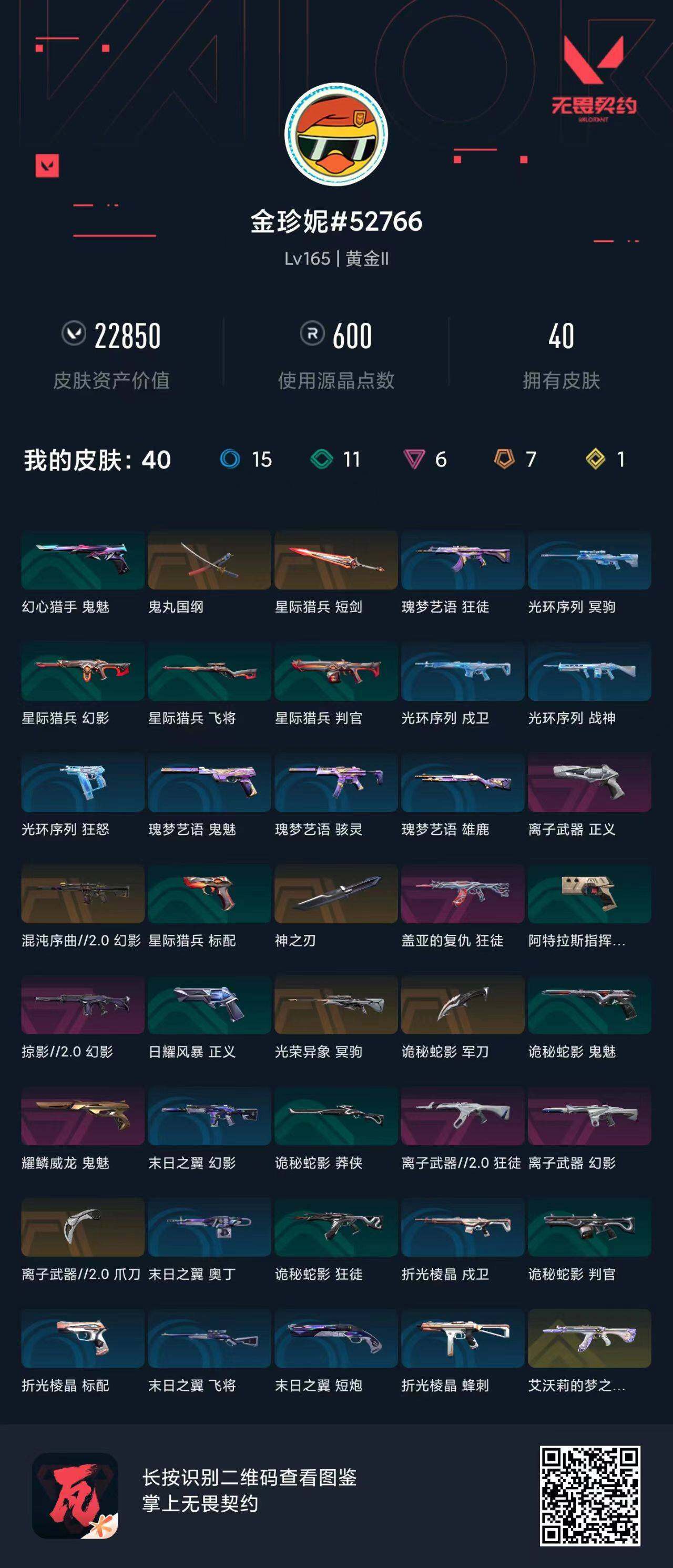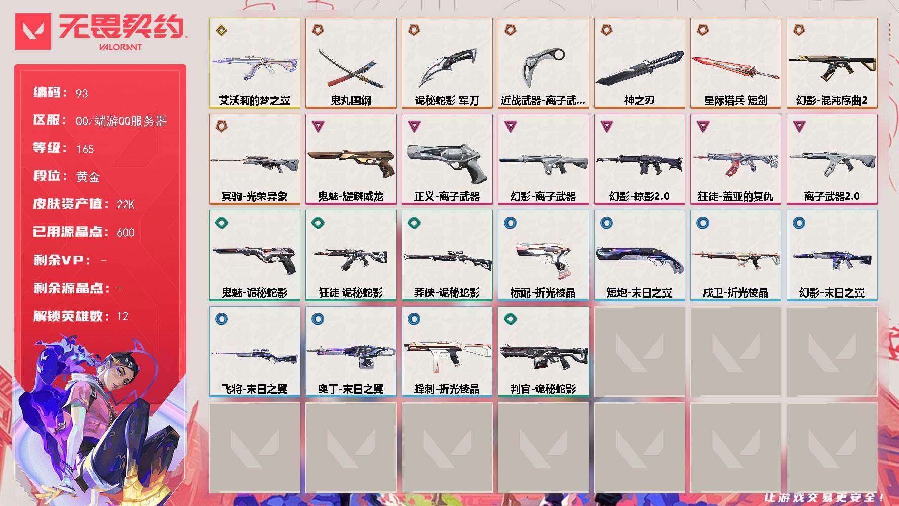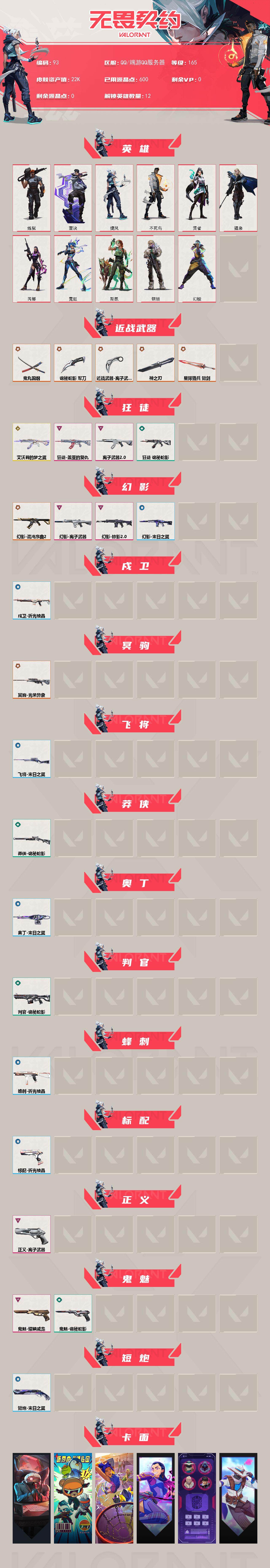 [13817771]【英雄】:幻棱,炼狱,壹决,捷风,不死鸟,贤者,猎枭,芮娜,霓虹,斯凯,钢锁 【近战 武器】:近战武器-神之刃,近战武器-鬼丸国纲,近战武器-离子武器//2.0 爪刀,近战武器-诡秘蛇影 军刀,近战武器-星际猎兵 短剑 【狂徒】:狂徒-艾沃莉的梦之翼,狂徒-盖亚的复仇,狂徒-离子武器//2.0,狂徒-诡秘蛇影 【幻影】:幻影-混沌序曲//2.0,幻影-离子武器,幻影-掠影//2.0,幻影-末日之翼 【戍卫】:戍卫-折光棱晶 【冥驹】:冥驹-光荣异象 【飞将】:飞将-末日之翼 【莽侠】:莽侠-诡秘蛇影 【奥丁】:奥丁-末日之翼 【判官】:判官-诡秘蛇影 【蜂刺】:蜂刺-折光棱晶 【标配】:标配-折光棱晶 【正义】:正义-离子武器 【鬼魅】:鬼魅-耀鳞威龙,鬼魅-诡秘蛇影 【短炮】:短炮-末日之翼 【卡面】:生意人麦宝 卡面,战术熊与伙伴们 卡面,脚踝终结者 卡面 ,无畏契约GO!第一卷:芮娜 卡面,清除名单 卡面,无畏契约GO!第一卷:零 卡面,无畏契约GO!第一卷:贤者 卡面,钢锁vs盖可 卡面,代号红色 卡面,新兵报到 卡面,V契约 卡面,无畏契约 卡面 【喷漆】:审判之爪 喷漆,哨卫滑步 喷漆,买装还是存钱 喷漆,辣得好下饭 喷漆,胜利属于无畏契约 喷漆,GLHF 喷漆,无畏契约 喷漆 【挂饰】:薰衣草之心 挂饰,天外飞客 挂饰,晒出笑脸 挂饰,无畏契约 纪念币 挂饰