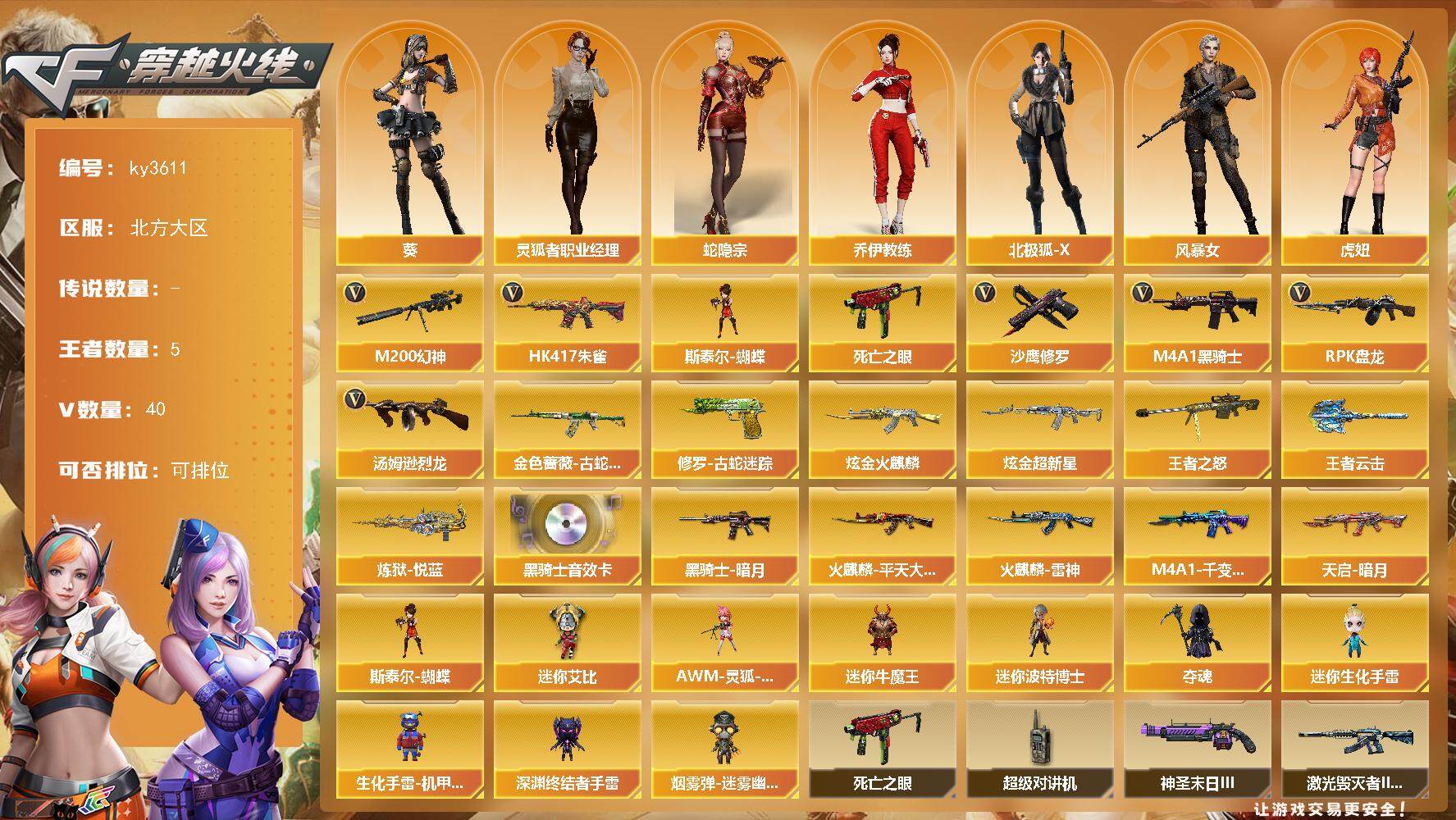 [13853051]北方大区-40V-5王者-2炫金 【热门武器】:HK417-朱雀,M200-幻神,金色蔷薇-古蛇迷踪,修罗-古蛇迷踪,死亡之眼,M4A1-黑骑士,汤姆逊-烈龙*4,RPK-盘龙*3,斯泰尔-蝴蝶,沙鹰-修罗*3 【王者炫金武器】:王者之怒,炼狱-悦蓝,王者云击,炫金火麒麟,炫金超新星 【音效卡】:M4A1-黑骑士音效卡 【皮肤】:火麒麟-雷神,火麒麟-平天大圣*2,M4A1-千变-孔明皮肤,黑骑士-暗月,天启-暗月 【角色】:葵,蛇隐宗,乔伊教练,北极狐-X,风暴女,虎妞,嘉年华灵狐,娟娟,灵狐者-职业经理,麻雀,曼陀罗-礼服,潘多拉-X,莎莎,蛇姬,斯沃特-X,新娜塔莎 【人偶武器】:斯泰尔-蝴蝶,AWM-灵狐-15周年嘉年华,迷你牛魔王,迷你波特博士*2,夺魂*2,迷你生化手雷,生化手雷-机甲核心*2,深渊终结者手雷*2,迷你艾比,烟雾弹-迷雾幽灵 【暴走生化】:死亡之眼,超级对讲机 【挑战大师】:冰龙粉碎者-白马银枪,激光毁灭者III-白马银枪*2,神圣爆裂者-末日III 【英雄级武器】:AK47-火麒麟,M4A1-黑龙,M4A1-雷神,M4A1-黑骑士,AK12-天启,AN94-超新星,AK47-黑鲨,HK417-朱雀,无影-神兵利器,金色蔷薇-古蛇迷踪,烈火-动感闪耀,王者之武-觉醒版,王者火魄-觉醒版,Barrett-毁灭,Barrett-极光,AWM-裁决,M200-幻神,RPK-盘龙*3,汤姆逊-烈龙*4,沙鹰-修罗*3,沙鹰-天神*2,天神-动感闪耀,修罗-古蛇迷踪,屠龙*2,龙啸*2,擎天,屠龙-动感闪耀,手雷-动感闪耀,高爆手雷-古蛇迷踪,闪光弹-竞技荣光,烟雾弹-古蛇迷踪 【道具】:亚洲杯纪念炫彩背包,全能枪王背包,古蛇迷踪炫彩背包,超级背包,哔哩哔哩名片,救世主-黑桃战神,黄金生化钩*2,绿色巨人,灵魂忍者*2,变异宝贝,妖姬,迷雾幽灵,生化弹匣,夺命之镰,防化服*3,金色流光-枪王排位*2,星辰流光-枪王排位,枪王排位29赛季金色流光,古蛇迷踪打击特效,蛇隐宗表情,动感闪耀表情,防弹头盔*7,防弹衣*6,C4工具钳*4,手雷包*3 【特殊枪械】:蝴蝶斯泰尔+4烈龙,1黑骑士,4烈龙,3盘龙,1蝴蝶斯泰尔