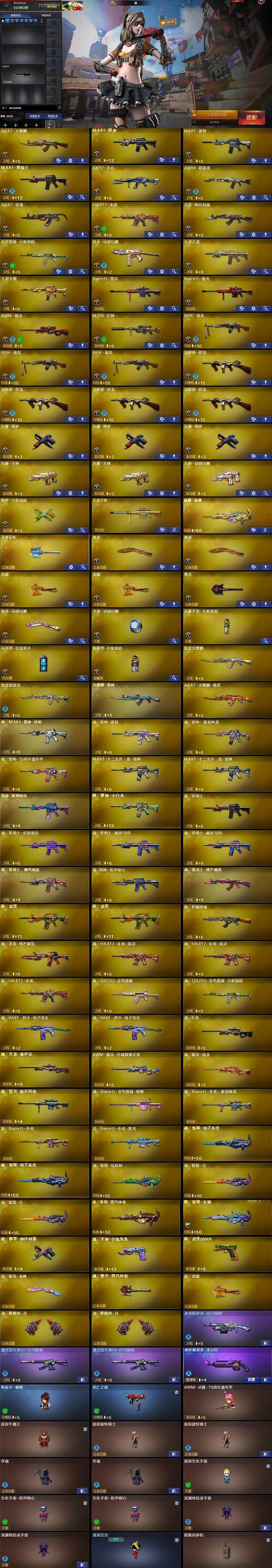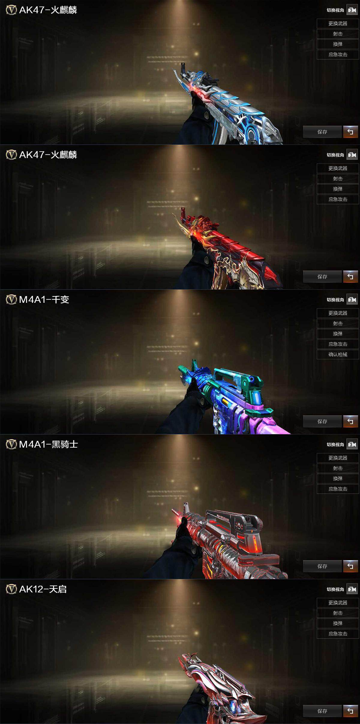 【英雄级武器】:AK47-火麒麟,M4A1-黑龙,M4A1-雷神,M4A1-黑骑士,AK12-天启,AN94-超新星,AK47-黑鲨,HK417-朱雀,无影-神兵利器,金色蔷薇-古蛇迷踪,烈火-动感闪耀,王者之武-觉醒版,王者火魄-觉醒版,Barrett-毁灭,Barrett-极光,AWM-裁决,M200-幻神,RPK-盘龙*3,汤姆逊-烈龙*4,沙鹰-修罗*3,沙鹰-天神*2,天神-动感闪耀,修罗-古蛇迷踪,屠龙*2,龙啸*2,擎天,屠龙-动感闪耀,手雷-动感闪耀,高爆手雷-古蛇迷踪,闪光弹-竞技荣光,烟雾弹-古蛇迷踪